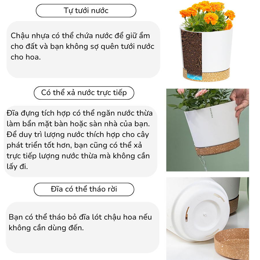 Chậu trồng cây tự tưới nước: Có 3 lỗ thoát nước để tưới nước và đơn giản hóa việc chăm sóc cây, giúp bạn dễ dàng tưới nước cho cây và tránh tắc nghẽn, thiết kế khóa độc đáo cho phép đĩa lót gắn vào chậu để dễ di chuyển và giữ nước. Bạn cũng có thể tháo đĩa lót ra để vệ sinh nồi dễ dàng.