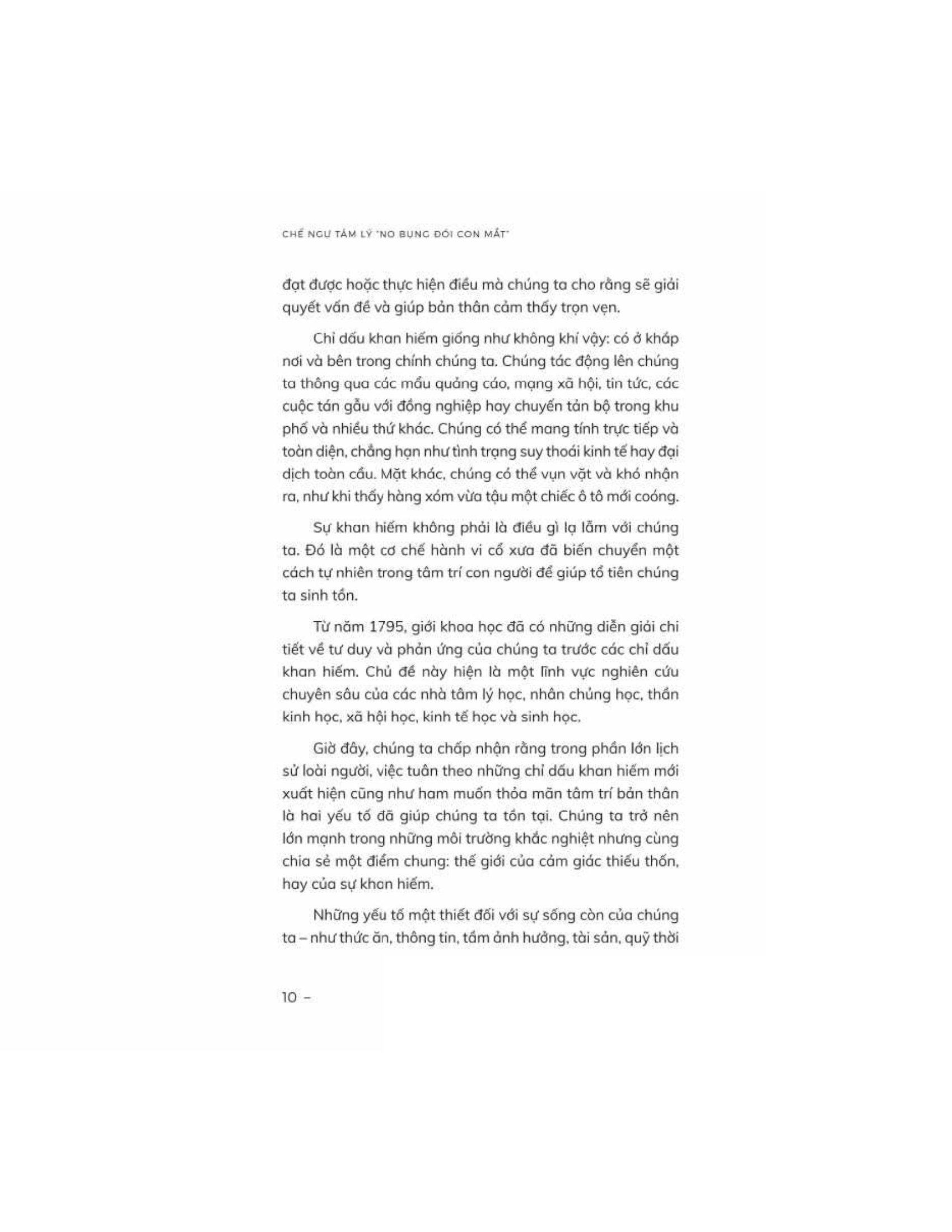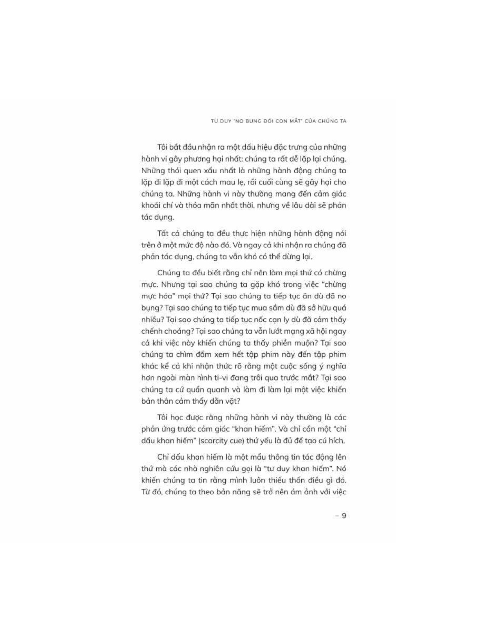 Chế Ngự Tâm Lý “No Bụng Đói Con Mắt” Thế giới đang dần trở nên quá tải với những thứ mà chúng ta luôn khao khát. Trong một thế giới tràn ngập ham muốn và sự quyến rũ của nhiều thứ khác, chúng ta cần hiểu tại sao con người luôn mong muốn nhiều hơn, đồng thời từ bỏ những thói quen xấu và tận dụng những gì chúng ta đang có. Chế Ngự Tâm Lý “No Bụng Đói Con Mắt” của Michael Easter đưa người đọc vào một hành trình kích thích tư duy để tìm hiểu sự phức tạp của tâm trí con người và lý do đằng sau những ham muốn vô độ của chúng ta. Easter khám phá khái niệm về tư duy khan hiếm, "vòng lặp thiếu thốn" - một chu kỳ liên tục khiến chúng ta mong muốn sở hữu nhiều hơn trong các khía cạnh khác nhau của cuộc sống, từ thực phẩm và của cải vật chất đến thông tin cũng như sức ảnh hưởng. Cuốn sách đi sâu vào khoa học đằng sau những ham muốn này, rút ra từ khoa học thần kinh, tâm lý học và nhân chủng học. Cuốn sách cũng đưa ra những phương pháp đơn giản giúp chúng ta hướng tới lối sống “vừa đủ”, củng cố những thói quen lành mạnh và sống trọn vẹn cũng như trân trọng những gì mình có, bao gồm: