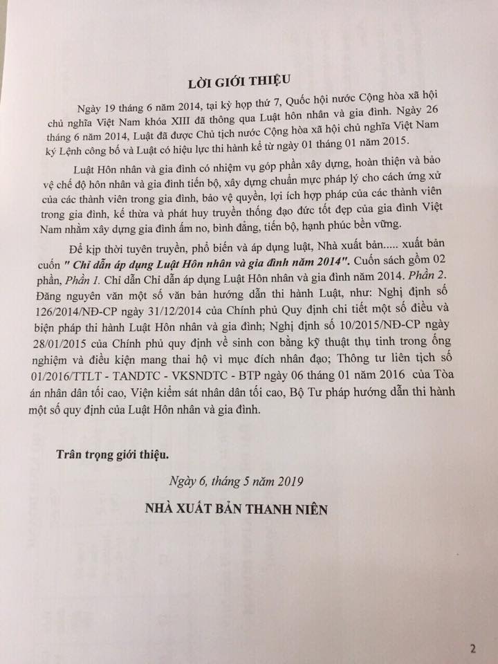 Ngày 19 tháng 6 năm 2014, tại kỳ họp thứ 7, Quốc hội nước Cộng hòa xã hội chủ nghĩa Việt Nam khóa XIII đã thông qua Luật Hôn nhân và gia đình. Ngày 26 tháng 6 năm 2014, Luật đã được Chủ tịch nước Cộng hòa xã hội chủ nghĩa Việt Nam ký Lệnh công bố và Luật có hiệu lực thi hành kể từ ngày 01 tháng 01 năm 2015. Luật Hôn nhân và gia đình có nhiệm vụ góp phần xây dựng, hoàn thiện và bảo vệ chế độ hôn nhân và gia đình tiến bộ, xây dựng chuẩn mực pháp lý cho cách ứng xử của các thành viên trong gia đình, bảo vệ quyền, lợi ích hợp pháp của các thành viên trong gia đình, kế thừa và phát huy truyền thống đạo đức tốt đẹp của gia đình Việt Nam nhằm xây dựng gia đình ấm no, bình đẳng, tiến bộ, hạnh phúc bền vững. Với mục đích tuyên truyền, phổ biến và áp dụng luật, Nhà xuất bản Thanh niên xuất bản cuốn Chỉ dẫn áp dụng Luật Hôn nhân và gia đình năm 2014 Nội dung cuốn sách gồm 2 phần như sau: Phần 1. Chỉ dẫn áp dụng luật hôn nhân gia và đình năm 2014. Phần 2. Các văn bản hướng dẫn luật hôn nhân gia đình