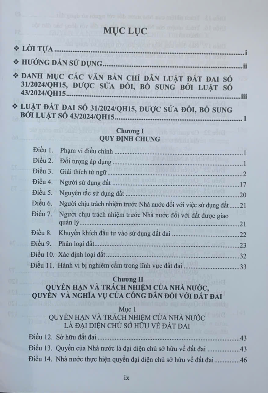 Để giúp các cơ quan, tổ chức, cá nhân có thể dễ dàng hiểu, tra cứu, áp dụng các quy định của Luật Đất đai số 31/2024/QH15 được sửa đổi, bổ sung bởi Luật số 43/2024/QH15; nhóm tác giả đã tập hợp, chọn lọc 70 văn bản liên quan trực tiếp đến việc áp dụng Luật Đất đai số 31/2024/QH15 được sửa đổi, bổ sung bởi Luật số 43/2024/QH15, bao gồm Hiến pháp, bộ luật, luật, nghị định, nghị quyết, thông tư, quyết định; công văn trao đổi nghiệp vụ, giải đáp nghiệp vụ, án lệ của Tòa án nhân dân tối cao để xây dựng cuốn sách: “CHỈ DẪN TRA CỨU ÁP DỤNG LUẬT ĐẤT ĐAI SỐ 31/2024/QH15 ĐƯỢC SỬA ĐỔI, BỔ SUNG BỞI LUẬT SỐ 43/2024/QH15”.
