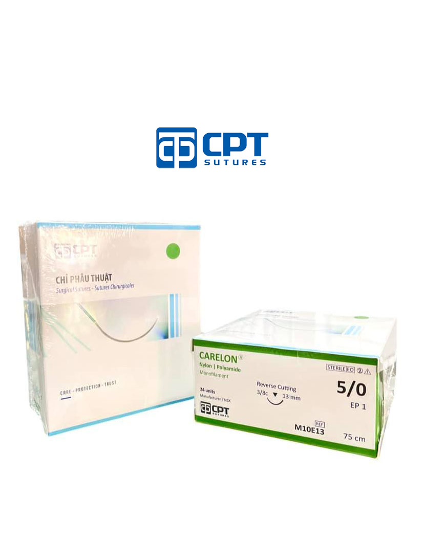 1. Chỉ phẫu thuật không tiêu CPT Carelon Nylon: size cỡ chỉ: 5/0 USP, dài 75 cm, kim tam giác 3/8c, dài 13 mm, mã hàng: M10E13. 2. Chỉ phẫu thuật không tiêu CPT