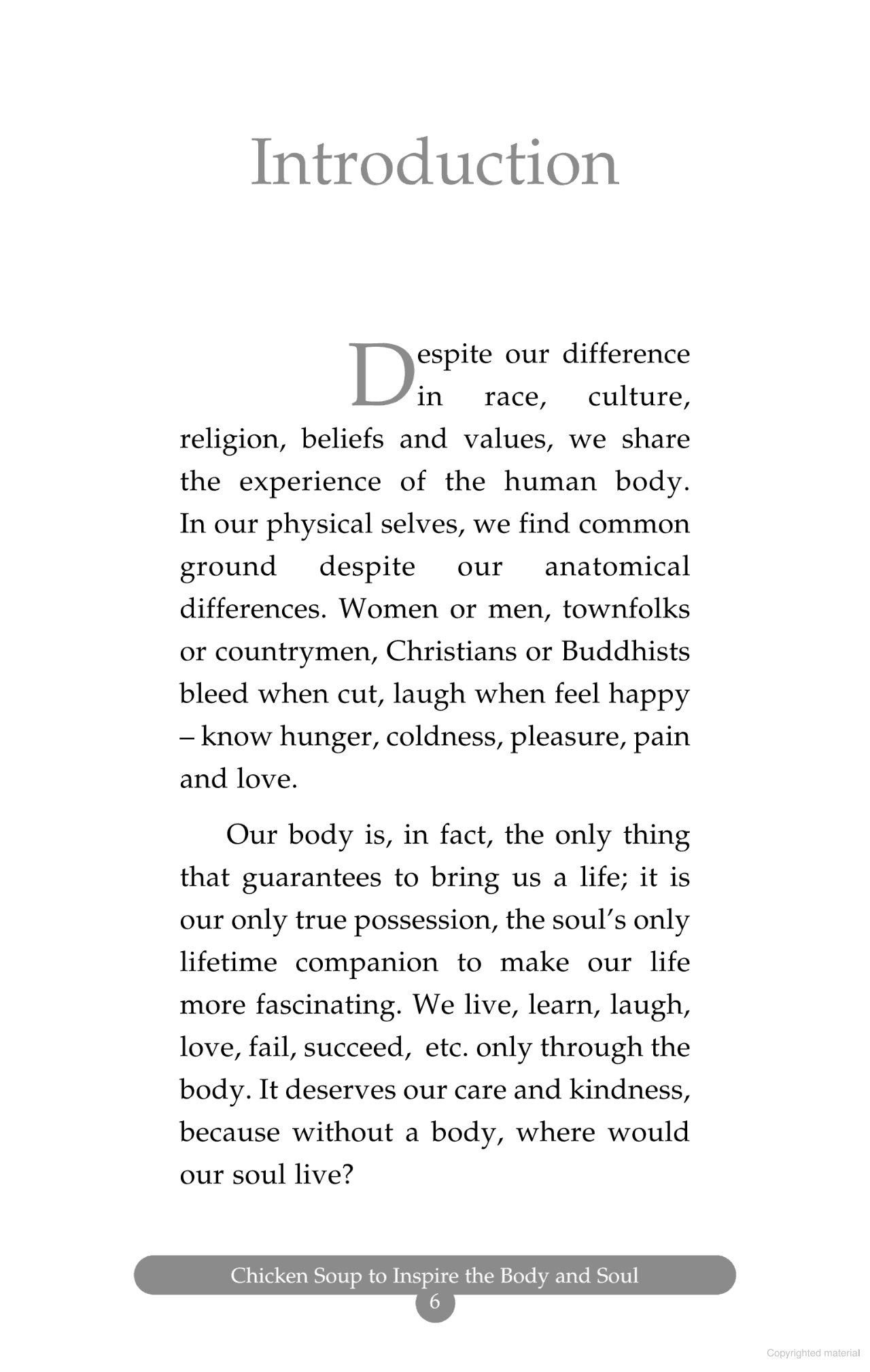 Chicken Soup to Inspire the Body and Soul được viết nhằm tôn vinh thân thể con người - yếu tố luôn phụng sự cho cuộc sống, mục tiêu, ước mơ, tranh đấu, dũng khí và tinh thần của mỗi con người. Những nỗ lực trong thể thao, nỗ lực làm việc và tồn tại, khi phải đổ mồ hôi vì những vất vả thể chất, hoặc những khi cơ thể hồi phục sau chấn thương hay bệnh tật, tất cả đều là thử thách sẽ trui rèn bản thân mỗi người. Vì tất cả những điều kể trên, cơ thể luôn đóng vai trò là một người bạn thân, một người hỗ trợ đáng tin cậy. Cơ thể cũng trung thành với ta như một chú chó trung trung thành với chủ, nũng nịu như một chú mèo con và có thể như một con đại bàng dũng mãnh nâng ta bay cao. Nếu ta trân trọng và quan tâm đúng mức, thân thể sẽ hết lòng phụng sự cho đến khi ta rời khỏi thế gian này.