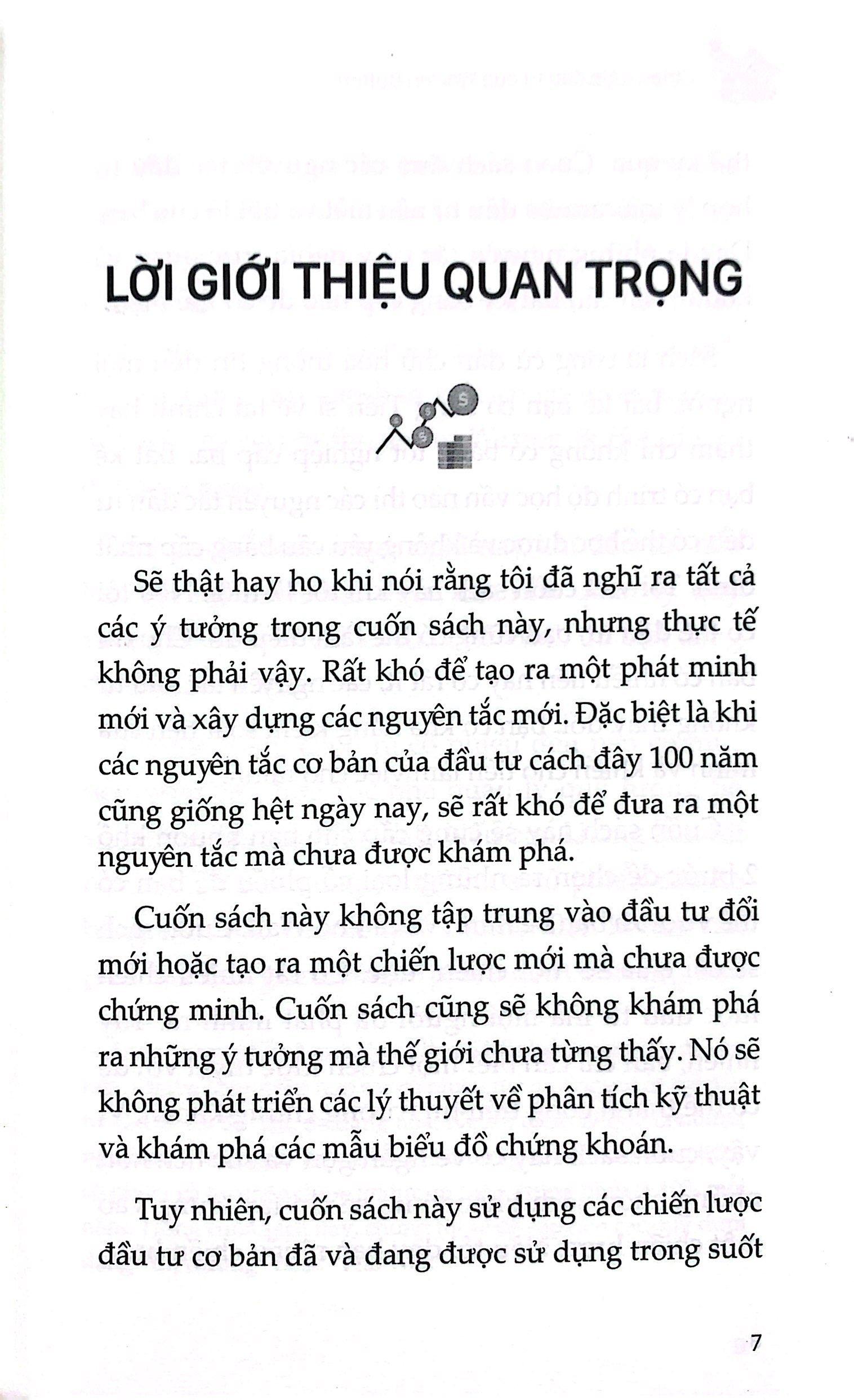 Cuốn sách này không tập trung vào đầu tư đổi mới hoặc tạo ra một chiến lược mới mà chưa được chứng minh. Cuốn sách cũng sẽ không khám phá ra những ý tưởng mà thế giới chưa từng thấy. Nó sẽ không phát triển các lý thuyết về phân tích kỹ thuật và khám phá các mẫu biểu đồ chứng khoán. Tuy nhiên, cuốn sách này sử dụng các chiến lược đầu tư cơ bản đã và đang được sử dụng trong suốt thế kỷ qua.