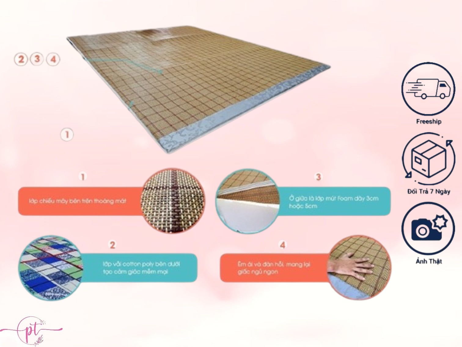 Mua tại TiktokVào mùa hè nắng nóng, sự mềm mại của những sợi vải nệm hoặc drap bỗng trở thành điều gây khó chịu vì chúng ôm sát cơ thể khi nằm, gây ra cảm giác hầm nóng (nếu bạn không có máy lạnh). Đó cũng là lí do mà chiếu điều hòa được sản xuất với tác dụng chính là mang lại sự thông thoáng cho vùng lưng người nằm, và đặc biệt phù hợp với những khách hàng yêu thích cảm giác nằm trên tấm lót mỏng dưới sàn. Cấu tạo sản phẩm gồm 3 lớp:
