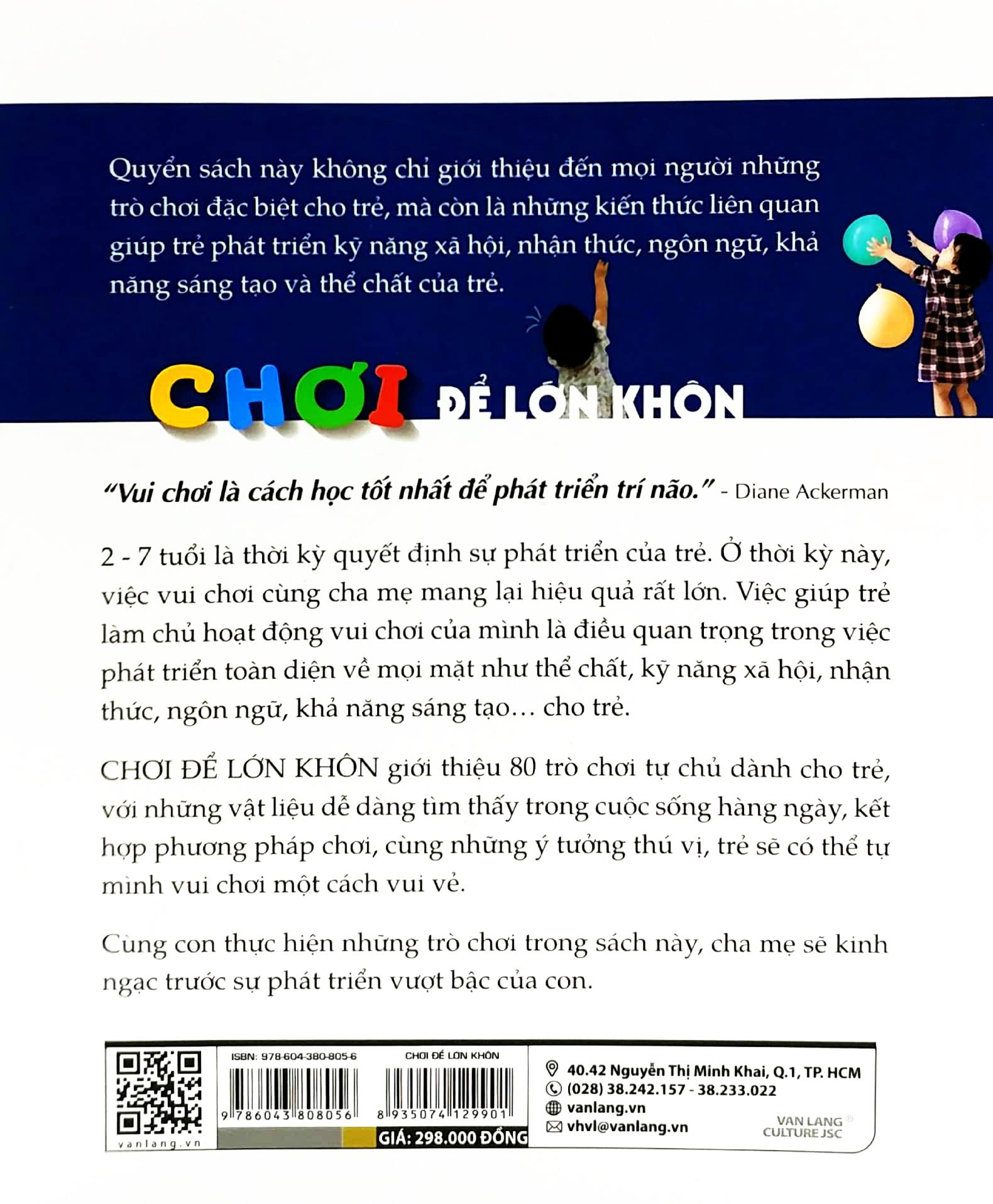 CHƠI ĐỂ LỚN KHÔN giới thiệu 80 trò chơi tự chủ dành cho trẻ, với những vật liệu dễ dàng tìm thấy trong cuộc sống hàng ngày, kết hợp phương pháp chơi, cùng những ý tưởng thú vị, trẻ sẽ có thể tự mình vui chơi một cách vui vẻ.