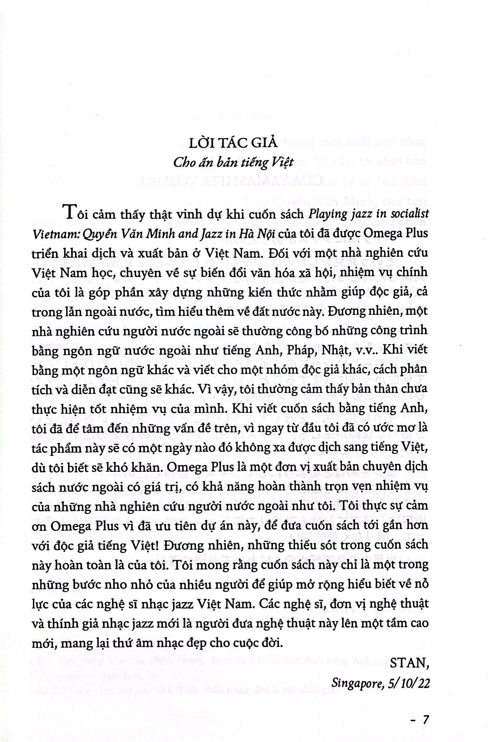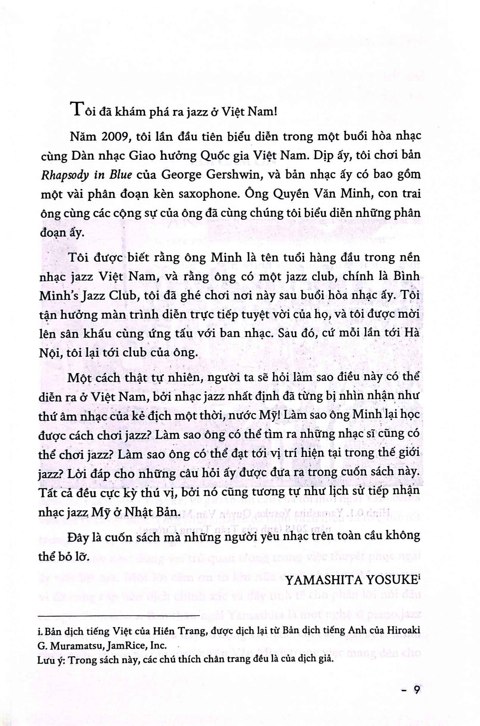Jazz - một thể loại âm nhạc bắt nguồn từ cộng đồng người châu Phi ở Hoa Kỳ vào cuối thế kỷ 19 - đầu thế kỷ 20, đã lan ra khắp thế giới và hiện diện ở mọi nền văn hóa âm nhạc quốc gia. Nhạc jazz mang đậm tính nghệ sĩ, đầy nét đặc trưng và khiến những thính giả khi đã thích rồi sẽ như một kẻ si tình với nó. Ở Việt Nam, jazz cũng có rất nhiều câu chuyện riêng, kiến thức “nhập môn” riêng để khám phá, như người Việt chơi jazz ở Việt Nam là ai? Họ học chơi jazz ở đâu, bằng cách nào? Có thật là họ “chơi jazz” không? Những câu hỏi ấy sẽ được giải đáp trong Chơi jazz ở Việt Nam: Quyền Văn Minh và nhạc jazz Hà Nội - cuốn sách kể lại cuộc hành trình jazz ra đời ở Việt Nam, tập trung vào câu chuyện của nghệ sĩ Quyền Văn Minh - người đã tận hiến đời mình cho việc phát triển jazz ở mảnh đất quê hương, để thuật lại sống động cách mà nhạc jazz được nghe, được học và được biểu diễn ở nơi này. Không phải một bài phỏng vấn tiêu chuẩn mà ta vẫn thường đọc trên báo chí, nội dung cuốn sách như góp nhặt từ những lần ngồi xuống tâm tình, hàn huyên cùng một người bạn đáng tin cậy, để từ chuyện đời mà nghe ra chuyện nhạc, chuyện jazz. Tác phẩm là bước đệm cho những nghiên cứu và hiểu biết sâu hơn về nhạc jazz ở Việt Nam. ĐÁNH GIÁ/NHẬN XÉT CỦA CHUYÊN GIA “Đây là cuốn sách mà những người yêu âm nhạc trên toàn cầu không thể bỏ lỡ”. - Yamashita Yosuke TRÍCH ĐOẠN HAY