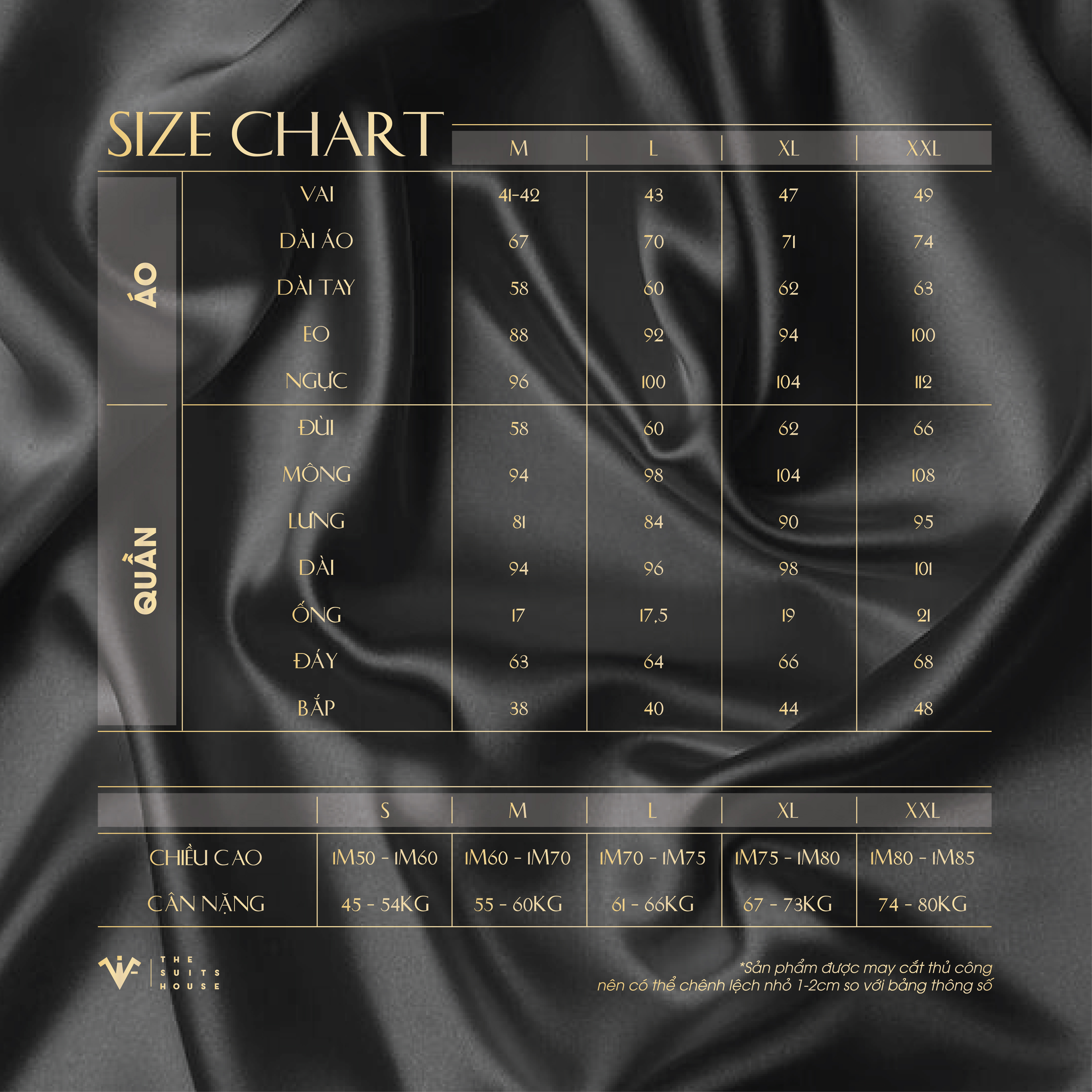 - Size: M L XL XXL (có bảng size cụ thể) • Một bộ suit bao gồm: