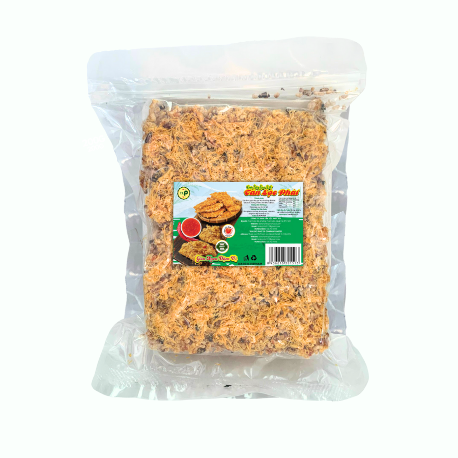 Thành phần: 90% vi cá đuối khô, 10% gia vị (đường, muối, ớt, chất điều vị mononatri L-glutamat 621, tiêu) Hạn sử dụng: 12 tháng kể từ ngày sản xuất Hướng dẫn sử dụng: Sử