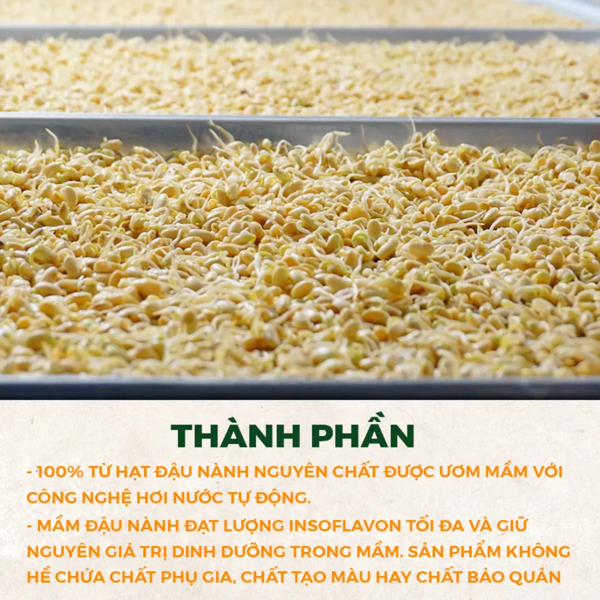 GIỚI THIỆU: ❉ Mầm đậu nành MS được sản xuất từ những hạt đậu thuần chủng vùng trồng nguyên liệu tại Lâm Đồng. ❉ Mầm được ủ tự nhiên nên hạt mầm lên đều, chất