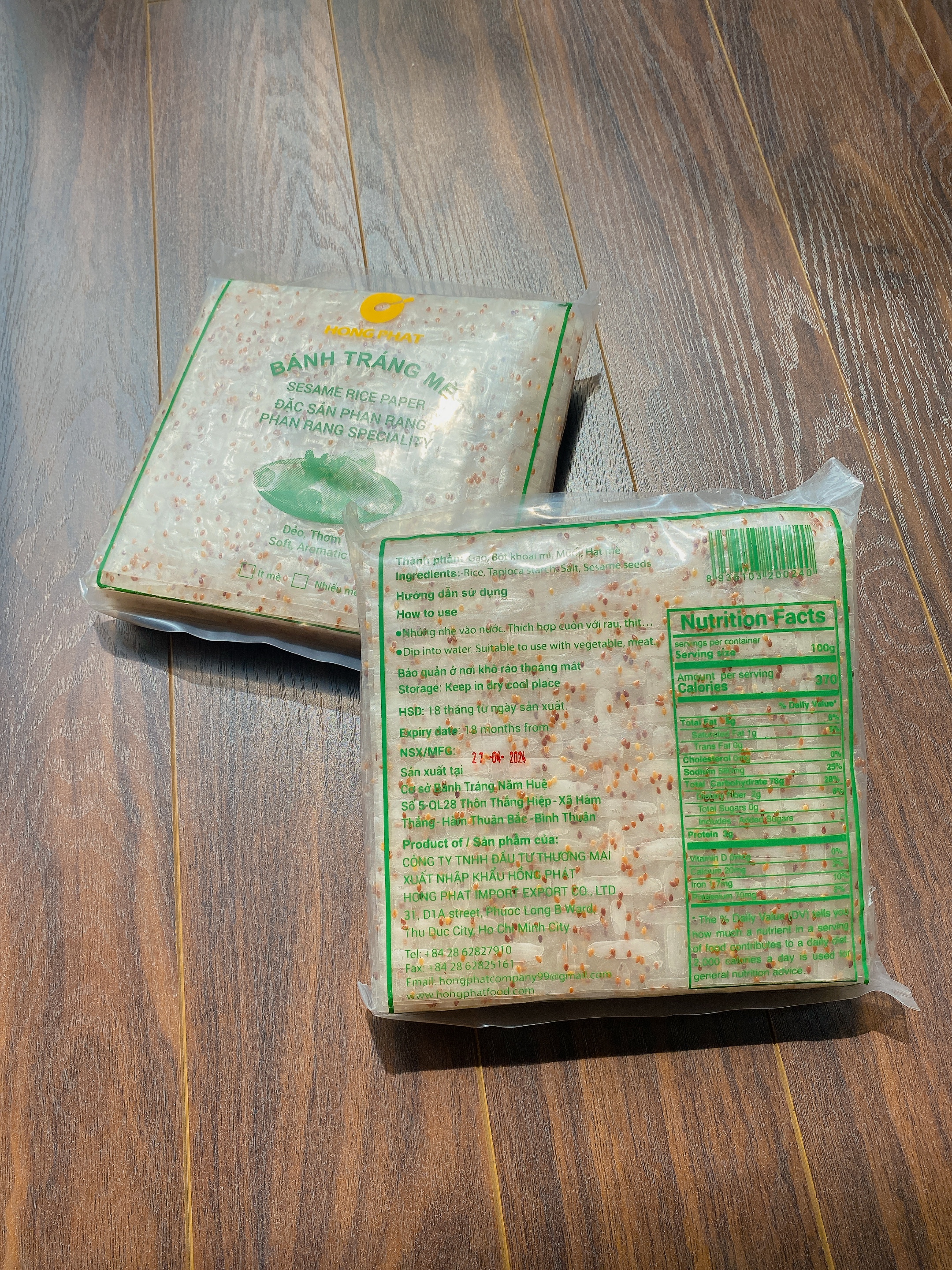 Bánh tráng mè, bánh tráng gỏi cuốn mè Hồng Phát đặc sản Phan Rang gói 400g Sản phẩm làm từ Gạo, bột khoai mì, muối và hạt mè. Nhúng nhẹ vào nước. Thích hợp cuốn
