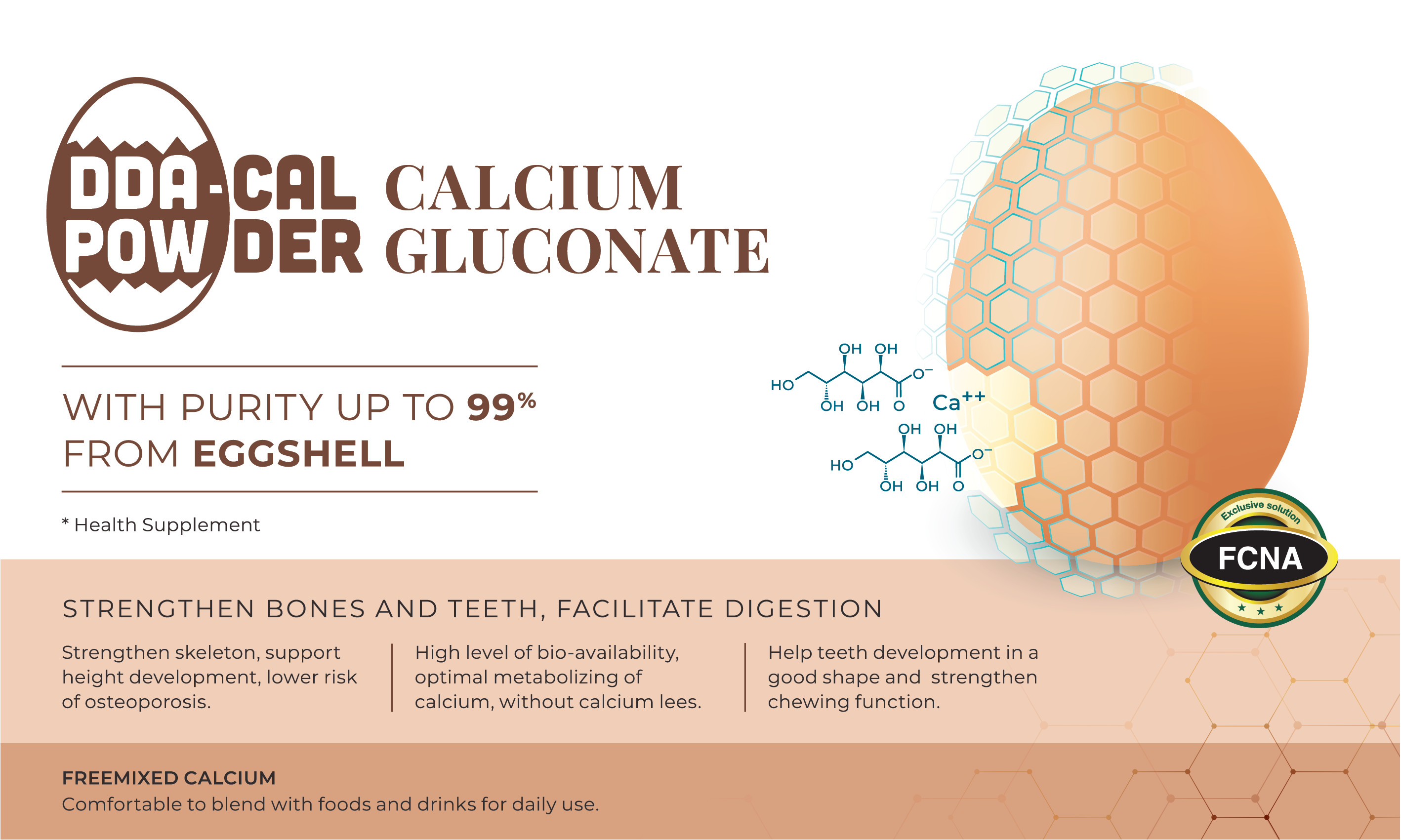 Thực phẩm chức năng canxi hữu cơ DDA chiết xuất từ vỏ trứng gà tinh khiết 99.9% dạng bột hoà tan nhanh, hỗ trợ giúp hệ xương chắc khoẻ, giảm loãng xương, còi xương, tăng chiều cao và các bệnh lý thiếu canxi, hỗ trợ mọc răng sớm, cho răng chắc & đều đẹp, tăng cường chức năng ăn nhai. Với nguồn canxi hữu cơ gốc gluconate thân thiện với hệ tiêu hoá, hấp thu tối đa lượng canxi, sản phẩm bảo vệ và hỗ trợ tối ưu cho quá trình tăng trưởng thể chất của bé và gia đình. Sản phẩm thích hợp cho bé từ 1 tuổi trở lên đến người lớn tuổi.