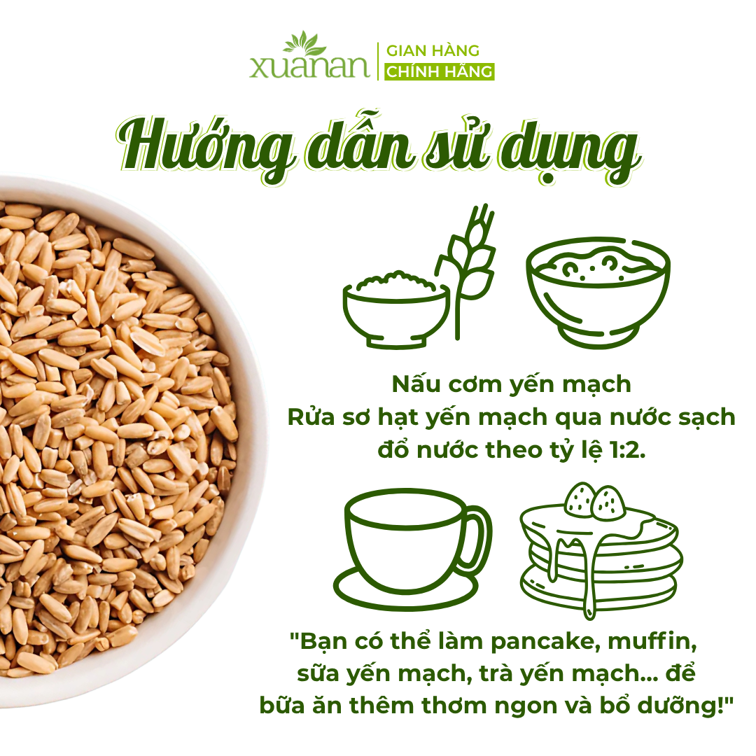 - Dùng làm: Bánh yến mạch, sữa yến mạch, mì yến mạch… Bảo quản: Bảo quản nơi khô ráo, thoáng mát; tránh tiếp xúc trực tiếp với không khí và ánh nắng mặt trời. Thông tin cảnh báo: Không dùng khi sản phẩm bị rách, mốc hoặc đã hết hạn sử dụng. Sản phẩm của: Công ty TNHH Thực Phẩm Dinh Dưỡng Xuân An
