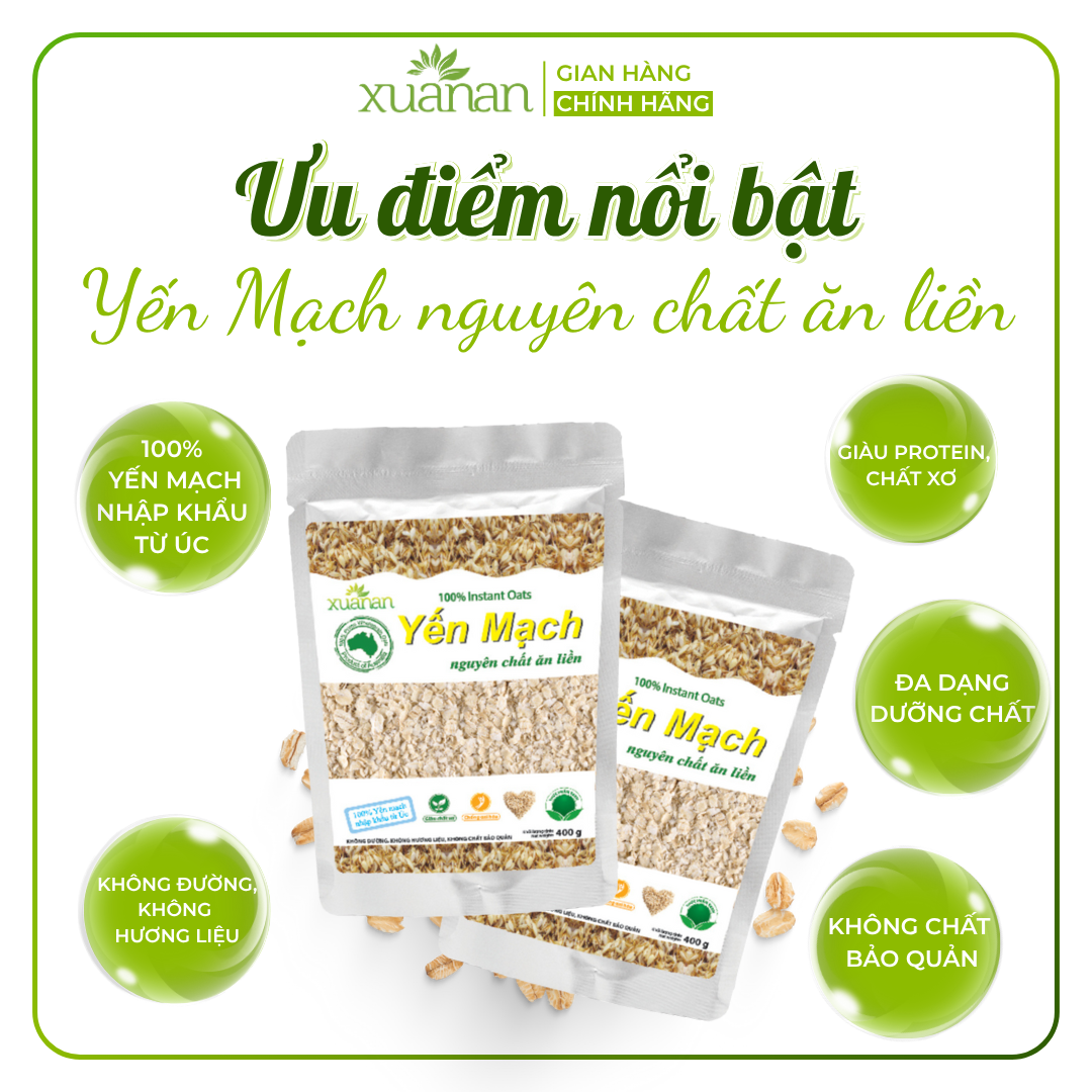 COMBO 11 TÚI YẾN MẠCH NGUYÊN CHẤT ĂN LIỀN – TÚI 400G Yến mạch là loại ngũ cốc giàu chất xơ, giàu đạm, vitamin và dưỡng chất tự nhiên. Yến mạch nguyên chất Xuân An (Instant Oats) 100% được nhập khẩu từ ÚC. Thành phần : 100% Yến mạch nguyên chất nhập khẩu từ Úc. Không chất bảo quản, không hương liệu, không phụ gia. Sử dụng Yến mạch hằng ngày giúp giảm nguy cơ tim mạch, tiểu đường, giảm lượng cholesterol trong máu. Phòng tránh bệnh loãng xương, ung thư, béo phì, táo bón. Giúp tăng khả năng tập trung, tránh suy nhược thần kinh, cũng cố hệ miễn dịch. Yến mạch có khả năng chống viêm và làm lành các vết thương trên da. Mặt nạ yến mạch làm sạch da và mịn da, dưỡng chất saponin giúp chống lão hóa hiệu quả. Đối tượng sử dụng : Thích hợp với mọi lứa tuổi. Tốt cho người ăn kiêng, tiểu đường, béo phì và táo bón. Quy cách đóng gói: 400g/túi – 24 túi/thùng Hướng dẫn sử dụng: Dùng ăn liền hoặc làm nguyên liệu chế biến bữa ăn trong gia đình. Pha 30 g yến mạch nguyên chất với 180 ml nước thật sôi, khuấy đều trước khi dùng, có thể thêm đường, sữa  (sữa bột, sữa tươi), hoặc trái cây tuỳ theo sở thích. Dùng nấu cháo: đun sôi khoảng 250 ml nước (cho một ít thịt, tôm, cá, hoặc lươn), nêm gia vị sau đó cho 50g yến mạch đun tiếp trong 3 phút rồi ăn. Bảo quản: Bảo quản nơi khô ráo, thoáng mát; tránh tiếp xúc trực tiếp với không khí và ánh nắng mặt trời. Thông tin cảnh báo: Không dùng khi sản phẩm bị rách, mốc hoặc đã hết hạn sử dụng. Sản phẩm của: Công ty TNHH Thực Phẩm Dinh Dưỡng Xuân An.