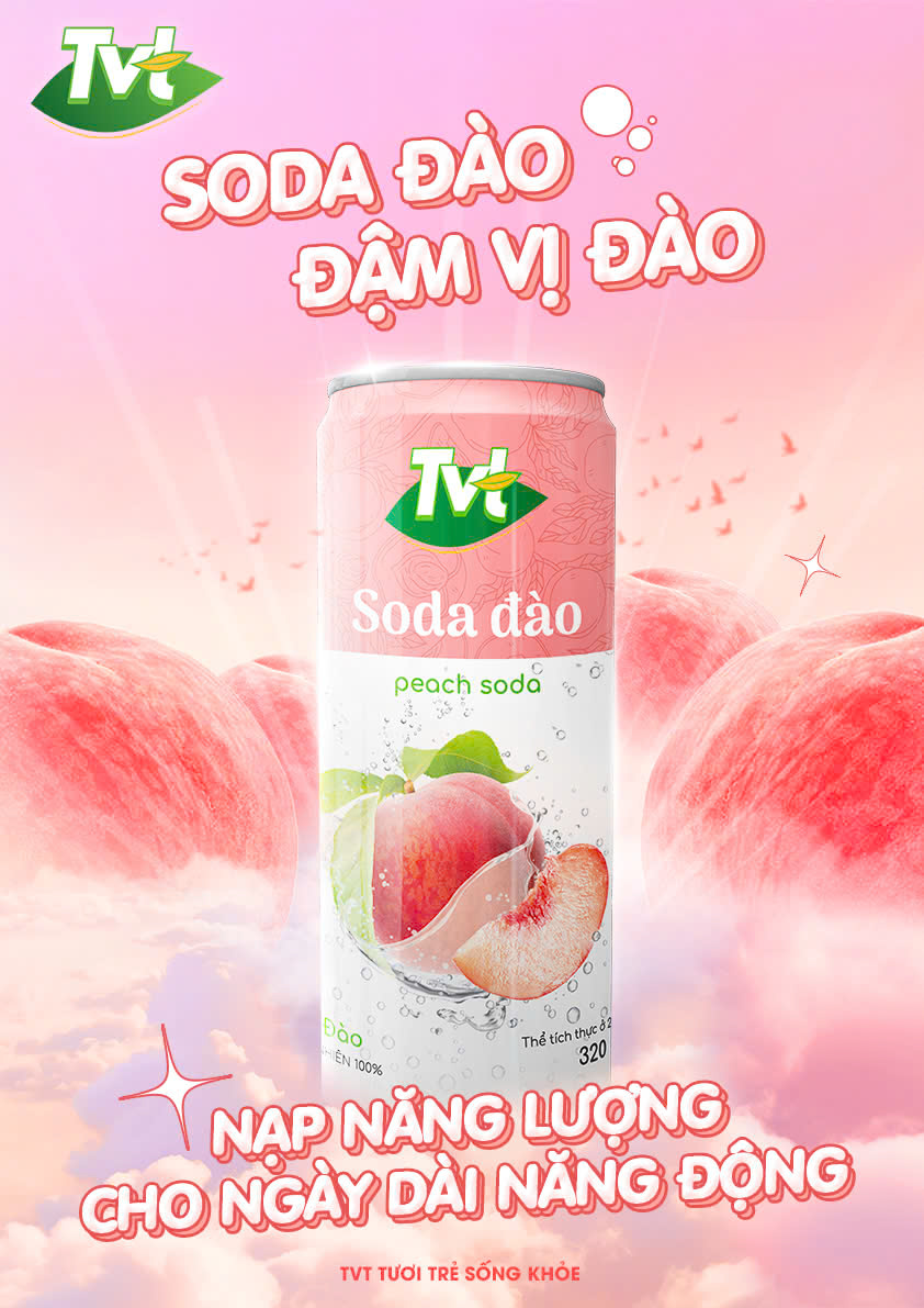 Soda Đào TVT - sự kết hợp hoàn hảo giữa nước cốt đào tự nhiên cùng soda nhẹ nhàng, mang đến cảm giác tươi mát, sảng khoái ngay từ lần đầu thưởng thức. Dòng sản