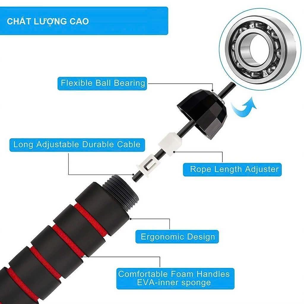 - Chất liệu bền bỉ:Dây nhảy được làm từ lõi thép chắc chắn, giúp đảm bảo độ bền cao khi sử dụng.