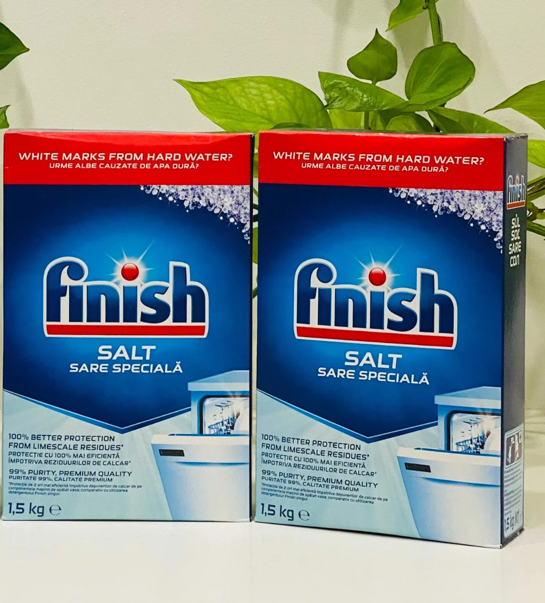 - Finish là thương hiệu rửa chén đĩa tự động số 1 Thế giới (được giới thiệu bởi hầu hết các thương hiệu máy rửa chén trên toàn Thế giới) Muối rửa chén Finish Dishwasher Salt giúp làm mềm nước trong máy rửa chén của bạn. Nước máy thông thường chứa nhiều canxi, magie sẽ gây lên sự tích tụ cặn vôi trong máy rửa chén, đồng thời làm giảm tính năng của viên rửa chén, gây tắc vòi phun nước, ống dẫn và đặc biệt tạo ra các mảng bám trên chén đĩa, các đồ sành sứ, thủy tinh, inox và các dụng cụ nhà bếp của bạn.