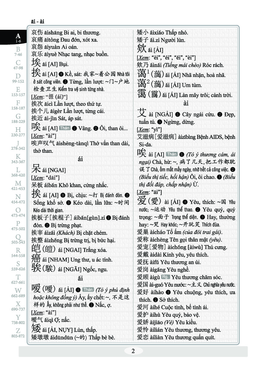 2. Từ điển 2 trong 1 Việt Hán Hán Việt hiện đại 1512 trang bìa cứng khổ lớn ( Hoa Việt 872 trang - Việt Hoa 640 trang) Tác giả: Trương Văn Giới & Lê Khắc Kiều Lục Nhà xuất bản Khoa Học Xã Hội Số trang: 1512 Kích thước: 14cm x 20cm x 6.9cm Cân nặng: 1500g Năm xuất bản: 2015