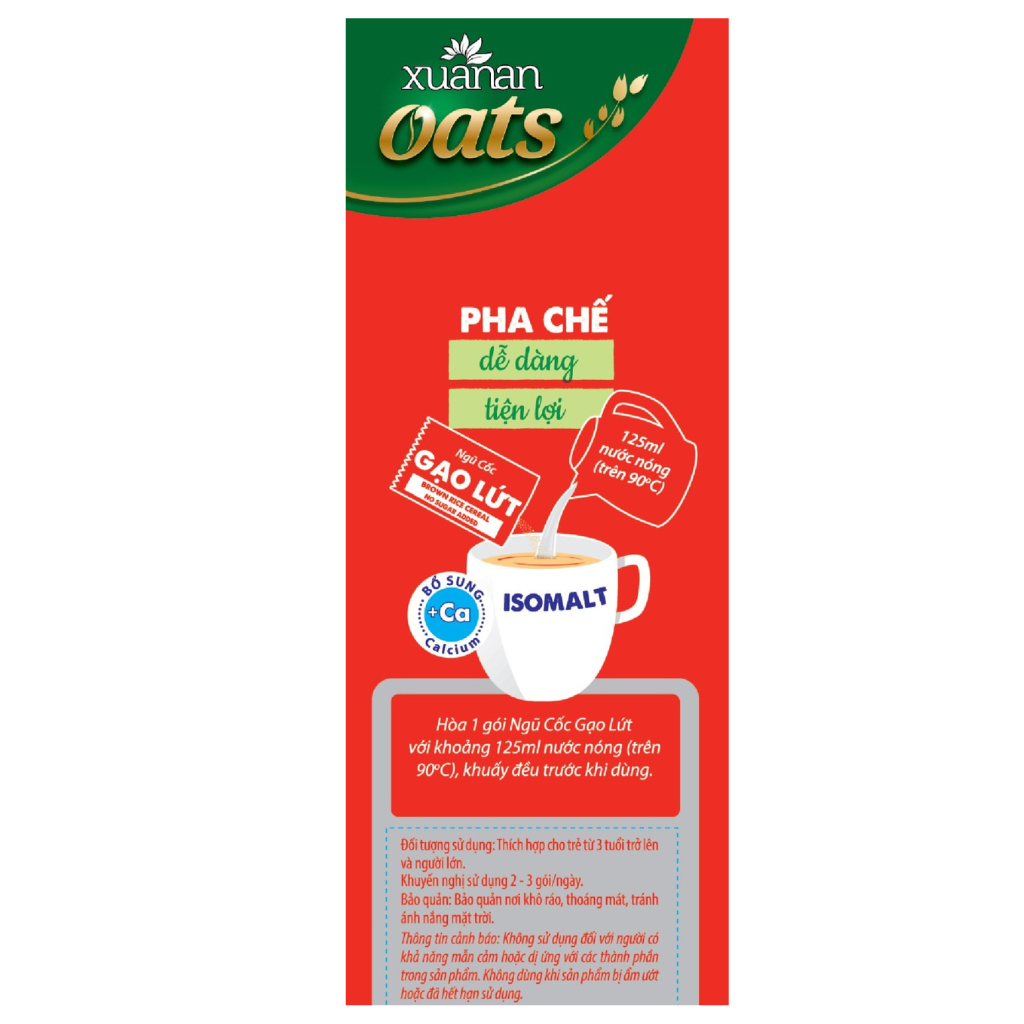 Combo N.Cốc Yến Mạch Hạnh Nhân Hạt Chia ít đường 400G(25G16 GÓI)+ N.Cốc Gạo Lứt No Sugar[đường ăn kiêng]400G(25G16 GÓI) Ngũ cốc GẠO LỨT no Sugar là thức uống thơm ngon bổ dưỡng, được làm từ gạo lứt, yến mạch, hạt sen và rất nhiều loại ngũ cốc. Sản phẩm được bổ sung thêm can xi, sử dụng đường ăn kiêng, không sử dụng đường mía. Vitamin, khoáng chất, chất xơ tự nhiên giúp hấp thu dinh dưỡng tốt và thanh lọc cơ thể. Thành phần: Ngũ cốc 60% (bột gạo lứt 10%, yến mạch 6%, đậu đen xanh lòng 3%, nếp cẩm 3%, bắp, đậu nành, gạo, lúa mỳ, lúa mạch), hạt sen 3%, bột kem thực vật, bột dừa, sữa bột tách béo 7% (Instant skim milk powder 7%), Isomalt 3%, Canxi 0.7%, Muối I-ốt, Chất làm dày xanthan gum (E415), chất tạo ngọt (INS 951), chất chống đông vón (E551), Maltodextrin, hương liệu tổng hợp dùng cho thực phẩm. Ngũ cốc YẾN MẠCH Hạnh nhân Hạt chia giàu dinh dưỡng và năng lượng, được làm từ yến mạch và nhiều loại ngũ cốc, ngoài ra còn có Hạnh nhân và Hạt chia là hai dưỡng chất chuyên biệt. Sản phẩm được bổ sung thêm can xi và sử dụng ít đường. Vitamin, chất xơ và đạm tự nhiên là nguồn dinh dưỡng tốt cho sức khỏe. Thành phần: Ngũ cốc 35% (Yến mạch 10%, bột gạo lứt 6%, bột gạo, bột bắp, bột đậu nành, bột lúa mì, bột lúa mạch), Hạt chia 3%, bột Hạnh nhân 3%, sữa bột nguyên kem, bột dừa, bột kem thực vật, đường, muối i-ốt, Canxi 0.7%, maltodextrin, chất là dày xanhthan gum (E415), chất chống đông vón (E551), hương liệu tổng hợp dùng cho thực phẩm. 6.75 gr đường trong khẩu phần 25g. Đối tượng sử dụng: Trẻ từ 3 tuổi trở lên và người lớn, người ăn theo chế độ giảm đường. Hướng dẫn sử dụng: Hòa 1 gói Ngũ cốc với khoảng 125ml nước sôi, khuấy đều trước khi dùng. Dùng 2-3 gói mỗi ngày Bảo quản: Bảo quản nơi khô ráo, thoáng mát; tránh tiếp xúc trực tiếp với không khí và ánh nắng mặt trời. Thông tin cảnh báo: Không dùng khi sản phẩm bị rách, mốc hoặc đã hết hạn sử dụng Sản phẩm của: Công ty TNHH Thực Phẩm Dinh Dưỡng Xuân An