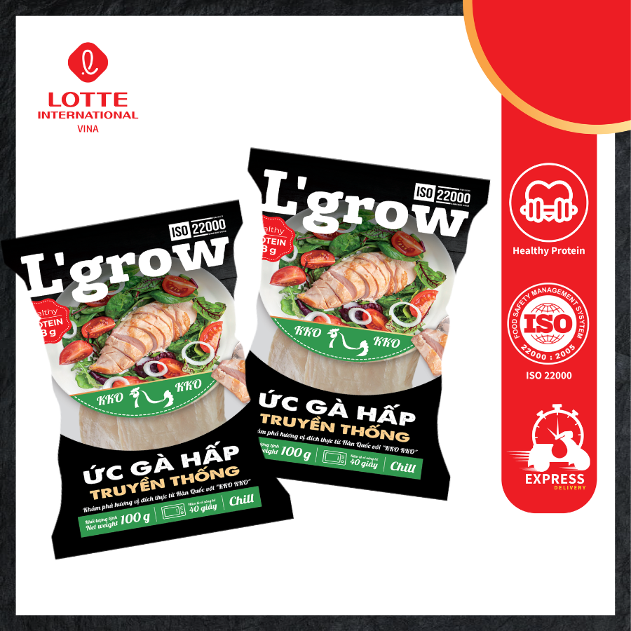 Ức gà (88 %), nước, nước tương, dầu mè, hỗn hợp gia vị (muối, chất điều vị (mononatri L-glutamat (INS 621), dinatri 5'- ribonucleotid (INS 635)), đường, bột tiêu), bột tỏi, rượu, gừng, chất chống oxy hóa: natri erythorbat (INS 316), chất bảo quản (natri propionat (INS 281), natri acetat (INS 262(i))), chất điều chỉnh độ acid/chất nhũ hóa: natri lactat ( INS 325)