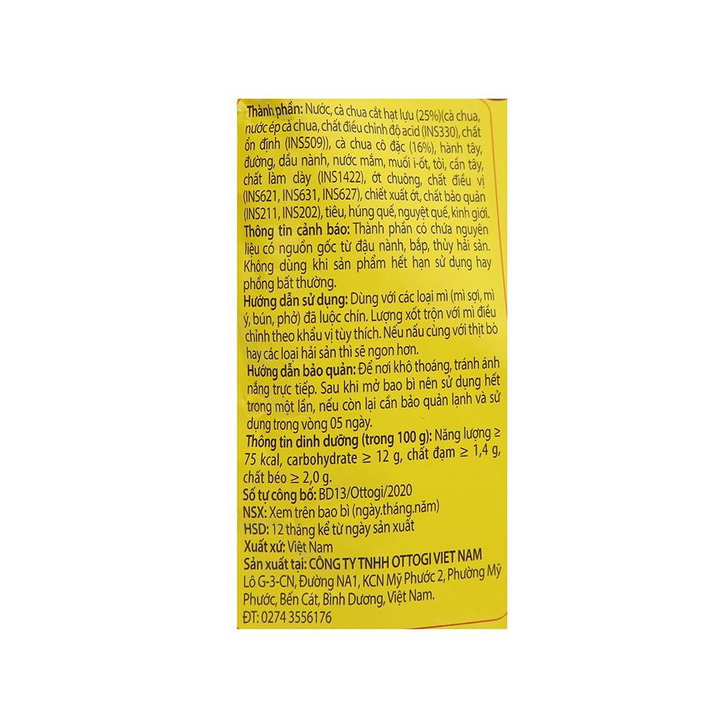 1. Khối lượng: 190g 2. Quy cách đóng gói: 36 hũ/thùng 3. Thành phần: Nước, nước tương, dầu hào, đường, dầu nành, tỏi, tiêu đen, cà chua cô đặc, muối, hành tím… 4. Cách bảo