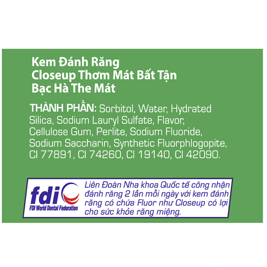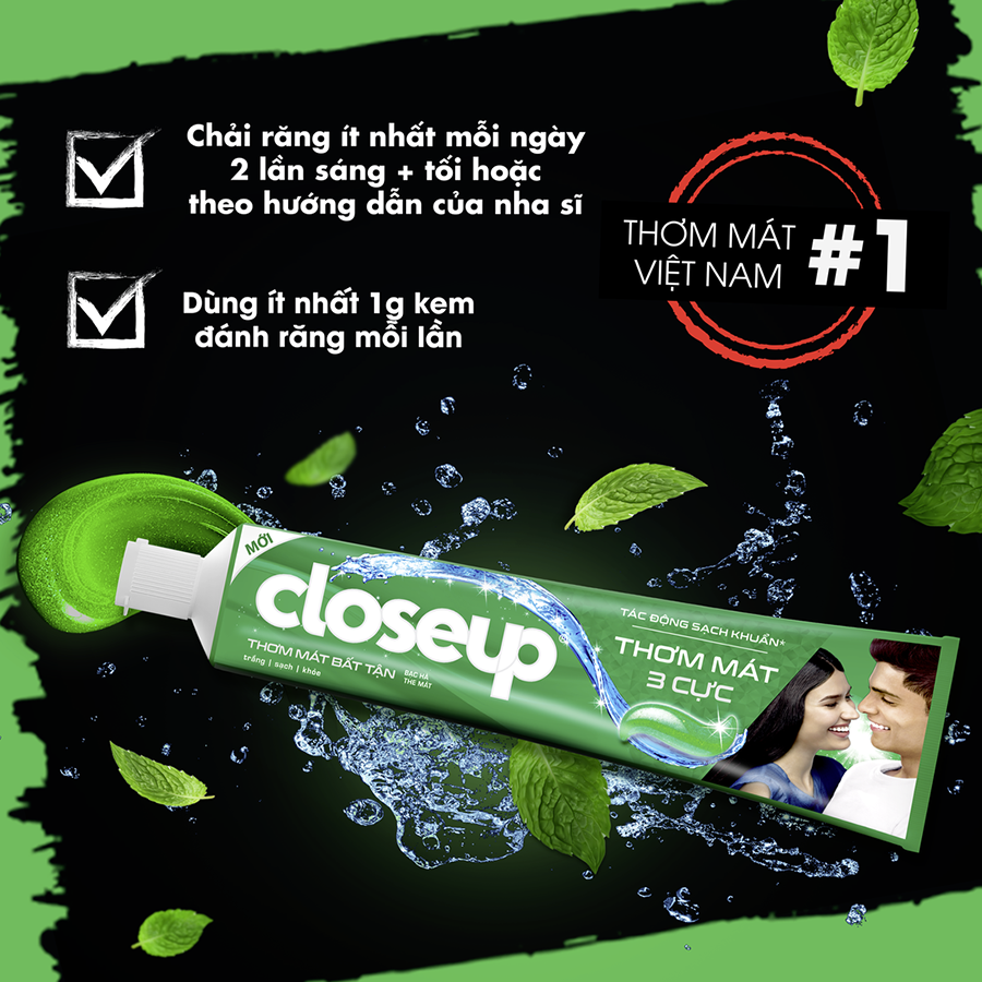BAO BÌ THAY ĐỔI THEO TỪNG ĐỢT NHẬP HÀNG Ưu điểm nổi bật Kem đánh răng dạng gel Closeup Thơm Mát Bất Tận - Bạc Hà The Mát với Công thức Thơm Mát 3 Cực hoàn toàn mới: Công thức nước súc miệng sạch khuẩn trong kem đánh răng Closeup cho tác động đánh bay vi khuẩn, trị hôi miệng, mang lại hơi thở thơm mát. Gel trong suốt giúp làm sạch sâu khoang miệng. Lõi kem chứa các tinh thể IceCool mang lại hơi thở thơm mát dài lâu. Hiệu quả sử dụng Hơi thở thơm mát Răng miệng sạch sâu Khoang miệng sạch khuẩn Hướng dẫn sử dụng Chải răng ít nhất mỗi ngày 2 lần sáng + tối hoặc theo hướng dẫn của nha sĩ Dùng ít nhất 1g kem đánh răng mỗi lần Trẻ em dưới 6 tuổi chỉ sử dụng một lượng kem đánh răng nhỏ bằng hạt đậu Tiết kiệm nước bằng cách đóng vòi nước trong khi chải răng