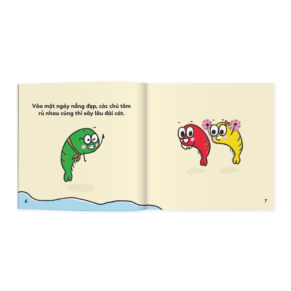 - "Cao thấp" là câu chuyện về 3 chú tôm: Tôm Xanh, Tôm Đỏ, Tôm Vàng rủ nhau thi xây lâu đài cát. Ai cũng nỗ lực để dành phần thắng về đội mình. Quá trình và kết quả xây lâu đài của ba chú tôm giúp bé học được phép so sánh: CAO – THẤP.