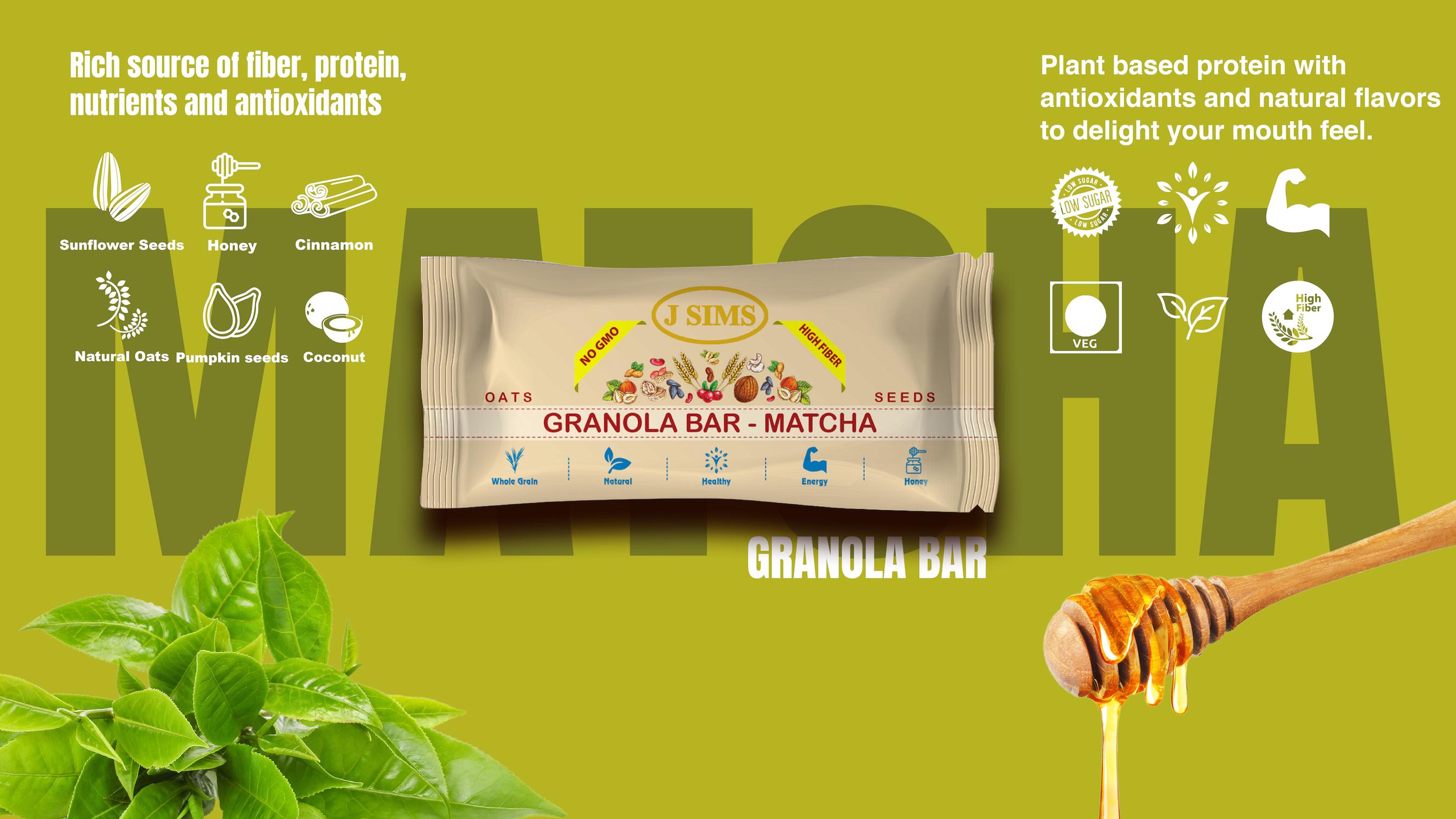 J SIMS Granola Bar Matcha Snack Heathy Nutritious Convenient Snack Just the right type of nutrition, when you have no time for a meal. Plant based nutrition that provides energy for a hard day at work.