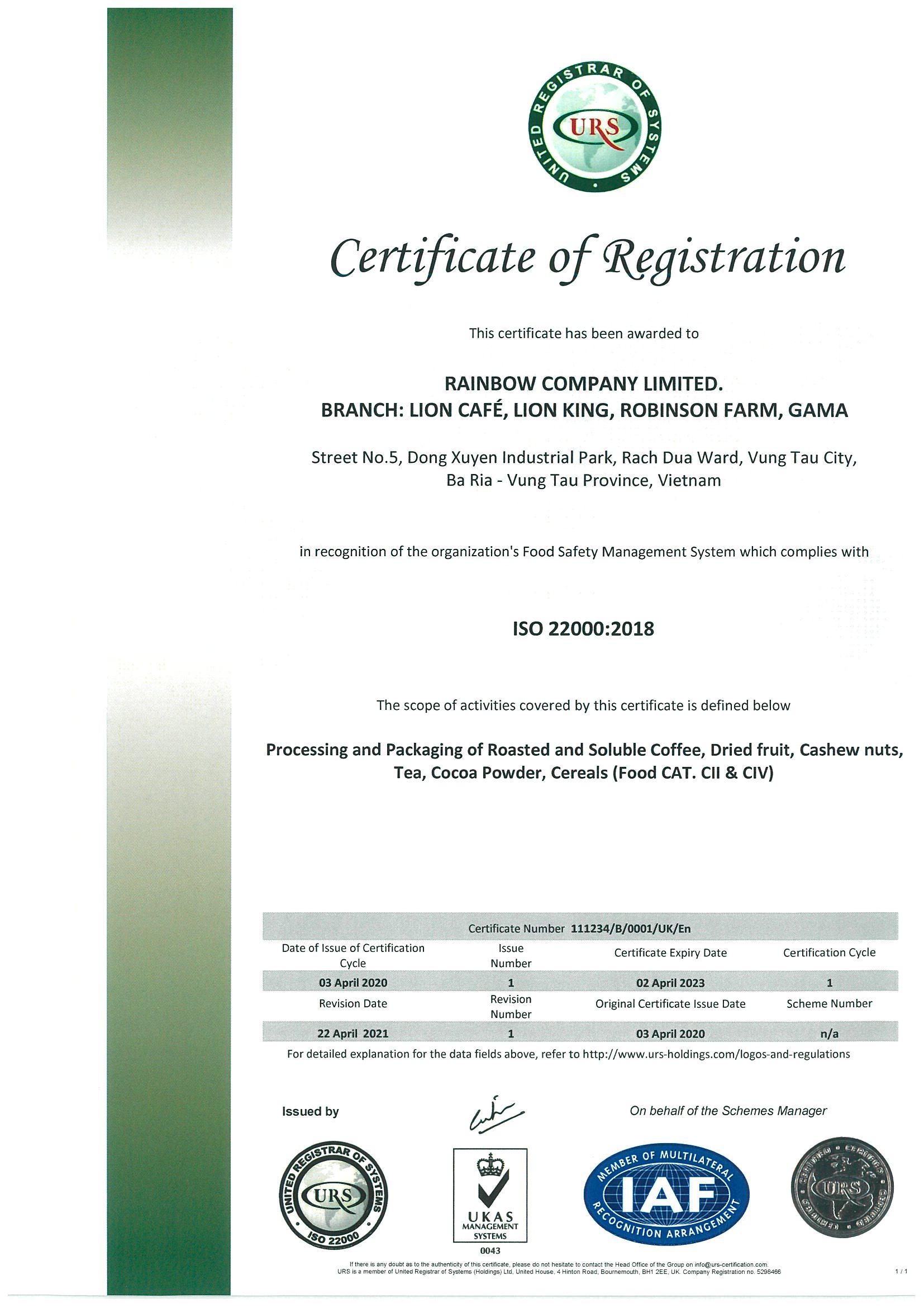 Các chứng chỉ công ty và Cafe Hoà Tan Lion 4in1 Capuccino Vị Dừa đã được công nhận: