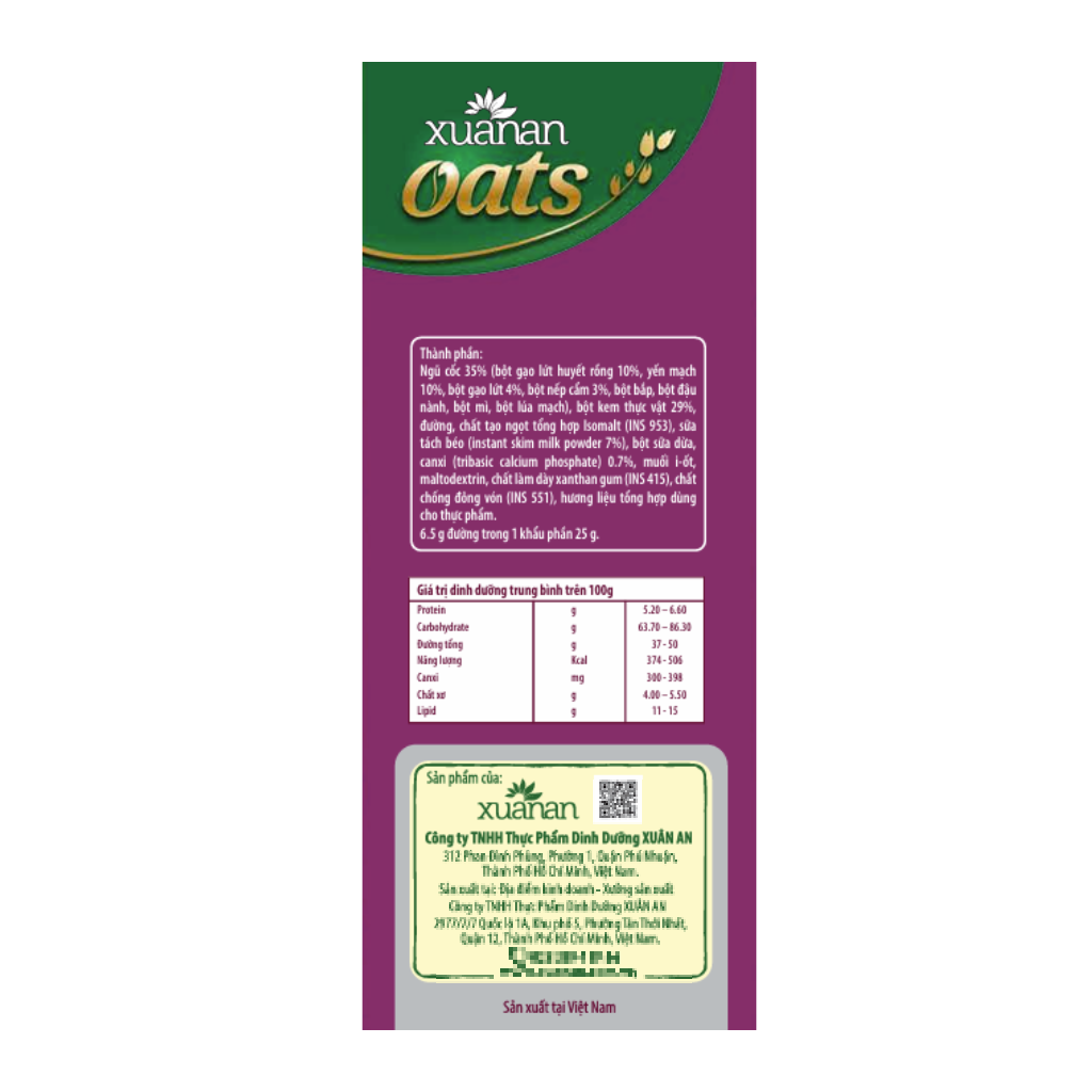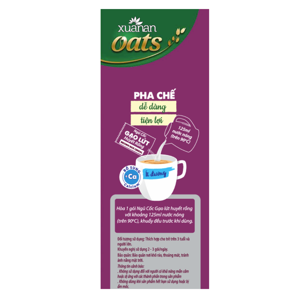 Combo NC Óc Chó Mè Đen 400gr (25G16 GÓI) + YM Hạnh Nhân Hạt Chia 400gr (25G16 GÓI) + Gạo Lức Huyết Rồng 400gr (25G16 GÓI) + Dinh Dưỡng Canxi 400gr (25G16 GÓI) +NC Yến Mạch 400gr (25G*16 GÓI) [ít đường] Yến Mạch, Óc chó và Mè đen là ba loại hạt được dùng khá phổ biến đối với mỗi gia đình vì chúng có tác dụng rất tốt cho sức khỏe. Đặc biệt, chúng phù hợp sử dụng với nhiều lứa tuổi, ngay cả trẻ nhỏ. Khi kết hợp 3 nguyên liệu này trong chế biến ngũ cốc thì chúng là loại ngũ cốc “Ngũ cốc Yến mạch, Óc chó và Mè đen” siêu hương vị thơm ngon, dinh dưỡng, ngậy béo nhưng không ngấy. Ngũ cốc YẾN MẠCH Hạnh nhân Hạt chia giàu dinh dưỡng và năng lượng, được làm từ yến mạch và nhiều loại ngũ cốc, ngoài ra còn có Hạnh nhân và Hạt chia là hai dưỡng chất chuyên biệt. Sản phẩm được bổ sung thêm can xi và sử dụng ít đường. Vitamin, chất xơ và đạm tự nhiên là nguồn dinh dưỡng tốt cho sức khỏe. Thành phần: Ngũ cốc 35% (Yến mạch 10%, bột gạo lứt 6%, bột gạo, bột bắp, bột đậu nành, bột lúa mì, bột lúa mạch), Hạt chia 3%, bột Hạnh nhân 3%, sữa bột nguyên kem, bột dừa, bột kem thực vật, đường, muối i-ốt, Canxi 0.7%, maltodextrin, chất là dày xanhthan gum (E415), chất chống đông vón (E551), hương liệu tổng hợp dùng cho thực phẩm. 6.75 gr đường trong khẩu phần 25g. Ngũ cốc DINH DƯỠNG can xi được làm từ rất nhiều loại ngũ cốc bằng công thứ đặc biệt. Sản phẩm được bổ sung Can xi giúp ngăn ngừa loãng xương và sử dụng ít đường. Vitamin, chất xơ và đạm tự nhiên là nguồn dinh dưỡng tốt cho sức khỏe. Thành phần: Ngũ cốc 32% (Yến mạch 10%, bột gạo lứt 5%, bột gạo, bột bắp, bột đậu nành, bột lúa mì, lúa mạch), sữa bột nguyên kem, bột dừa, bột kem thực vật, đường, muối i-ốt, Canxi 0.7%, maltodextrin, chất là dày xanhthan gum (E415), chất chống đông vón (E551), hương liệu tổng hợp dùng cho thực phẩm. 6.75 g đường trong 1 khẩu phần 25g. Ngũ cốc YẾN MẠCH được làm từ Yến mạch và nhiều loại Ngũ cốc bằng công thứ đặc biệt. Vitamin, chất xơ và đạm tự nhiên đem lại nguồn dinh dưỡng tốt cho sức khỏe. Sản phẩm được bổ sung thêm Can xi và sử dụng ít đường. Thành phần: Ngũ cốc 32% (Yến mạch 10%, gạo, gạo lứt 5%, bắp, đậu nành, lúa mì, lúa mạch), sữa bột nguyên kem, bột dừa, bột kem thực vật, đường, muối i-ốt, Canxi 0.7%, maltodextrin, chất là dày xanhthan gum (E415), chất chống đông vón (E551), hương liệu tổng hợp dùng cho thực phẩm. 7g đường trong 1 khẩu phần 25g. Ngũ cốc GẠO LỨT Huyet rong là thức uống thơm ngon bổ dưỡng, được làm từ gạo lứt, yến mạch và nhiều loại ngũ cốc. Sản phẩm được bổ sung thêm can xi và sử dụng ít đường. Vitamin, khoáng chất, chất xơ tự nhiên giúp hấp thu dinh dưỡng tốt và thanh lọc cơ thể. Thành phần: Ngũ cốc 32% (gạo lứt huyet rong 10%, yến mạch 6%, gạo lứt, gạo nếp cẩm 3%, bắp, đậu nành, lúa mỳ, lúa mạch), bột kem thực vật 29%, đường, đường ăn kiêng Isomalt, sữa tách béo 7%(Instant Skim Milk Powder &%), bột dừa, Canxi 0.7%, Muối I-ốt, maltodextrin, chất maltodextrin làm dày xanthan gum (E415), chất chống đông vón (E551), hương liệu tổng hợp dùng cho thực phẩm. 6.5 g đường trong khẩu phần 25g Đối tượng sử dụng: Trẻ từ 3 tuổi trở lên và người lớn, người ăn theo chế độ giảm đường. Hướng dẫn sử dụng: Hòa 1 gói Ngũ cốc YẾN MẠCH Hạnh nhân Hạt chia với khoảng 125ml nước sôi, khuấy đều trước khi dùng. Dùng 2-3 gói mỗi ngày Bảo quản: Bảo quản nơi khô ráo, thoáng mát; tránh tiếp xúc trực tiếp với không khí và ánh nắng mặt trời. Thông tin cảnh báo: Không dùng khi sản phẩm bị rách, mốc hoặc đã hết hạn sử dụng Sản phẩm của: Công ty TNHH Thực Phẩm Dinh Dưỡng Xuân An