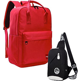 Bộ sản phẩm bao gồm 1 balo lớn màu đỏ và 1 túi đeo chéo nhỏ màu đen.