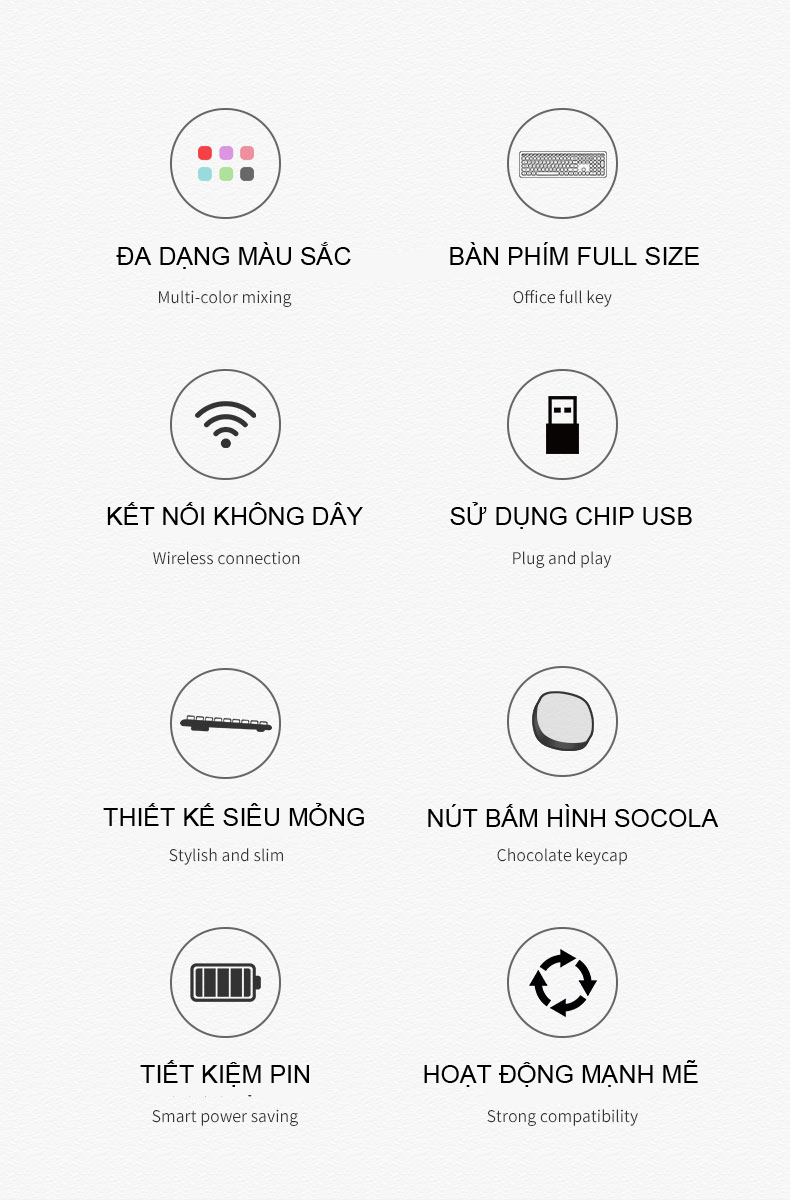 Không dây RF 2.4G: Công nghệ RF 2.4G, phạm vi không dây lên tới 10 mét. Bàn phím thoải mái và yên tĩnh: Bàn phím cấu hình thấp giúp gõ thoải mái. Bàn phím chống tràn: Thiết kế
