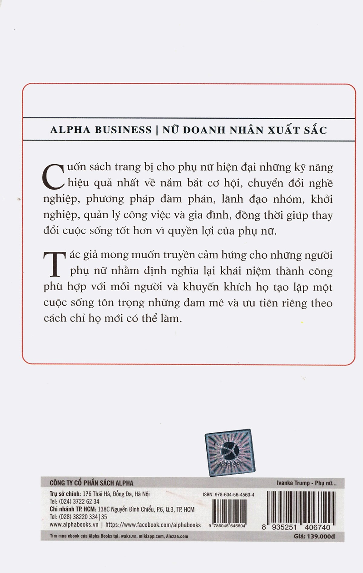 Đó chính là ý tưởng “Women Who Work” – Phụ nữ đi làm xuyên suốt cuốn sách gần 400 trang bạn đang cầm trên tay. Thông qua cuốn sách, nữ doanh nhân quyền lực, con gái của đương kim tổng thống Hoa Kỳ Donald Trump muốn đưa ra các giải pháp để rèn luyện và truyền sựu tự tin cho phụ nữ thể hiện bản thân tốt nhất, cả về nhân cách và sự nghiệp. Cô cam kết truyền cảm hứng để phụ nữ định nghĩa lại thành công theo những gì họ thấy quan trọng .