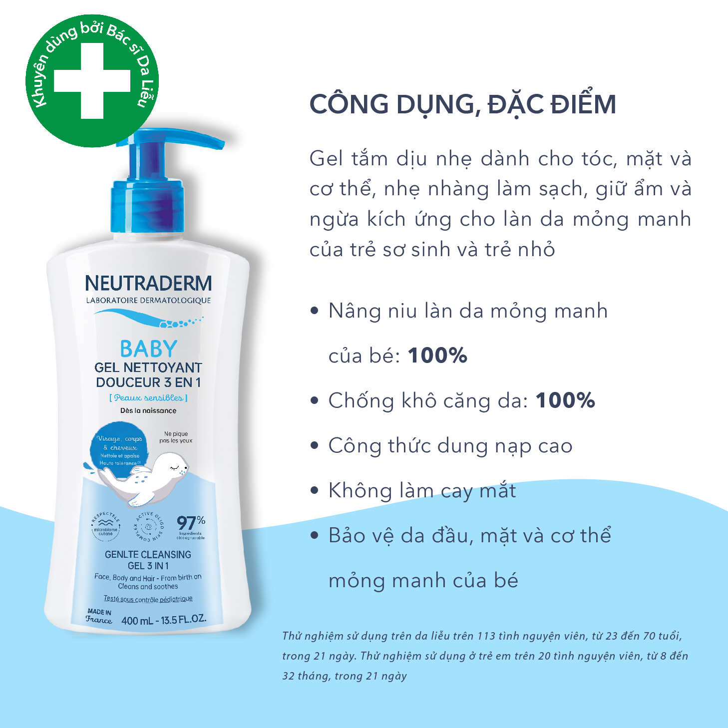 Gel Tắm Chăm Sóc Da Khô NEUTRADERM EXTRA RICH NEU Cách dùng: Đổ vài giọt vào tay và tạo bọt, nhẹ nhàng rửa sạch da mặt, da cơ thể và mái tóc của trẻ. Rửa sạch