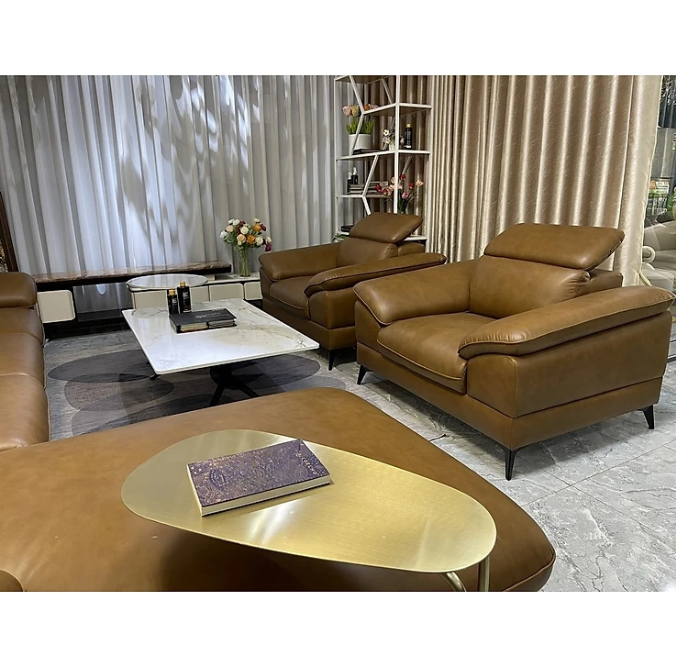 Gồm 1 chiếc sofa góc L, 2 ghế đơn cùng bàn trà mặt đá Ceramic phù hợp với gia đình 6 người. Sofa gam nâu trầm ấm cùng chất liệu da bò Ý mềm mại, mát vào hè, ấm vào đông là lựa chọn hoàn hảo cho không gian phòng khách sang, hiện đại mang lại trải nghiệm nghỉ ngơi thư giãn tuyệt vời ngay tại nhà.