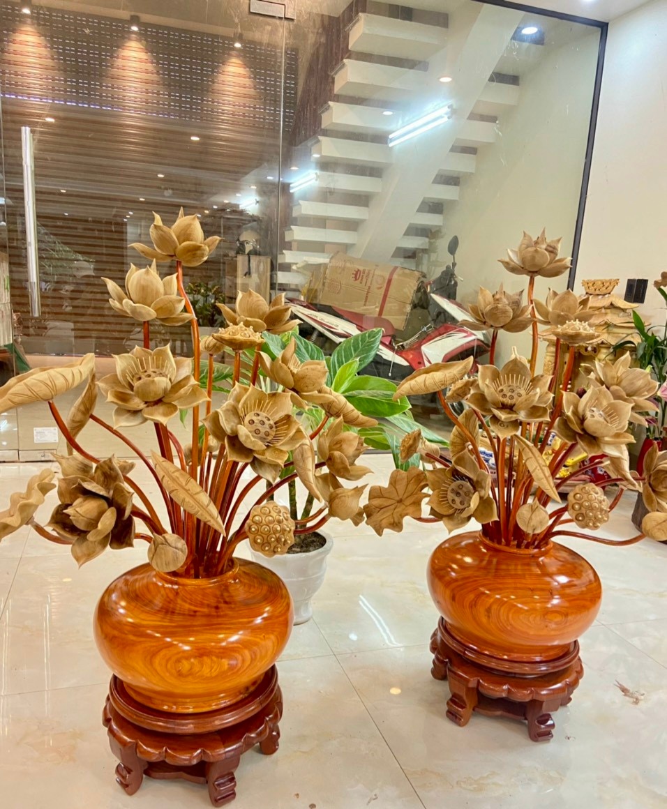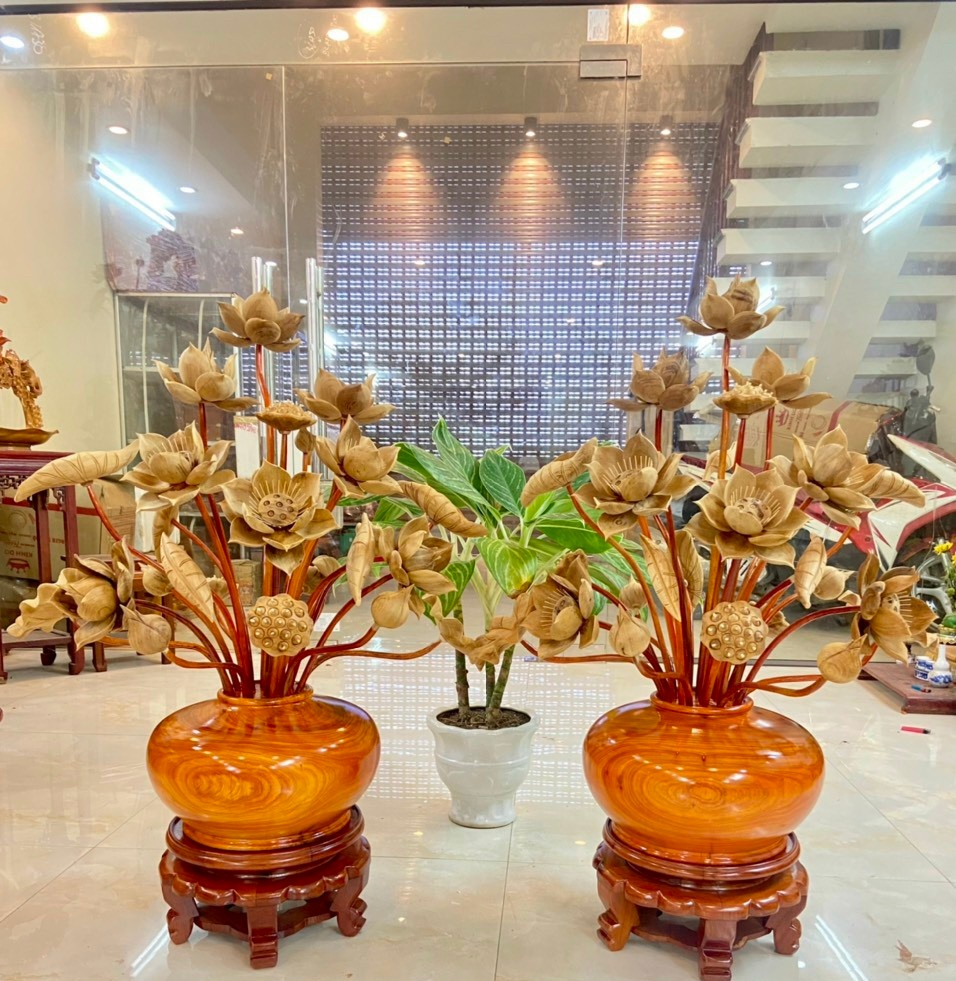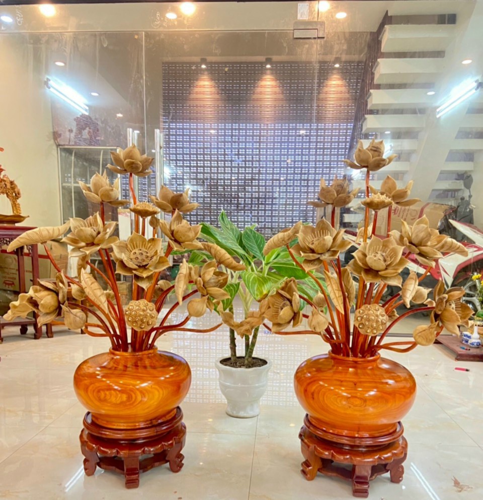 _ 2 bình hoa sen trang trí phòng thờ phòng khách ,được làm bằng chất liệu gỗ hương đỏ tự nhiên 100% _ Kt bình cắm 30×25cm + hoa lá gương cao tổng 92cm xòe