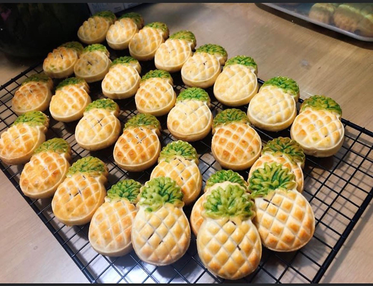 - Phân nhân Bước 1: Sơ chế dứa – Dứa đem rửa sạch với nước muối loãng, bỏ lõi. Băm nhỏ hoặc xay dứa, không nên xay quá nhuyễn để khi ăn vẫn cảm nhận được vị dứa lợn cợn, chua chua. – Lọc dứa qua rây lọc để loại bỏ phần nước, đồng thời giảm thời gian sên nhân. Bước 2: Sên nhân – Sau khi dứa đã ráo hẳn, cho vào chảo chống dính để bắt đầu sên. – Cho đường, bột quế, muối vào đảo đều với dứa trên lửa nhỏ, tiếp tục đảo thêm khoảng 15 phút nữa đến khi hỗn hợp bắt đầu sệt lại thì cho cornsyrup vào, lúc này hỗn hợp sẽ lỏng hơn, tiếp tục đảo liền tay đến khi hỗn hợp thật dẻo và dính, cảm giác nặng tay thì cho bột vào trộn đến khi bột tan hết là được. Nhân dứa khi sên đạt sẽ có mùi dứa thơm lừng, dẻo, ráo, tách khỏi lòng chảo, có thể vo viên sau khi để nguội. – Để nhân dứa nguội hẳn (để tủ mát qua đêm nhân sẽ dẻo hơn) và chia thành từ phần nhỏ theo kích thước bánh.