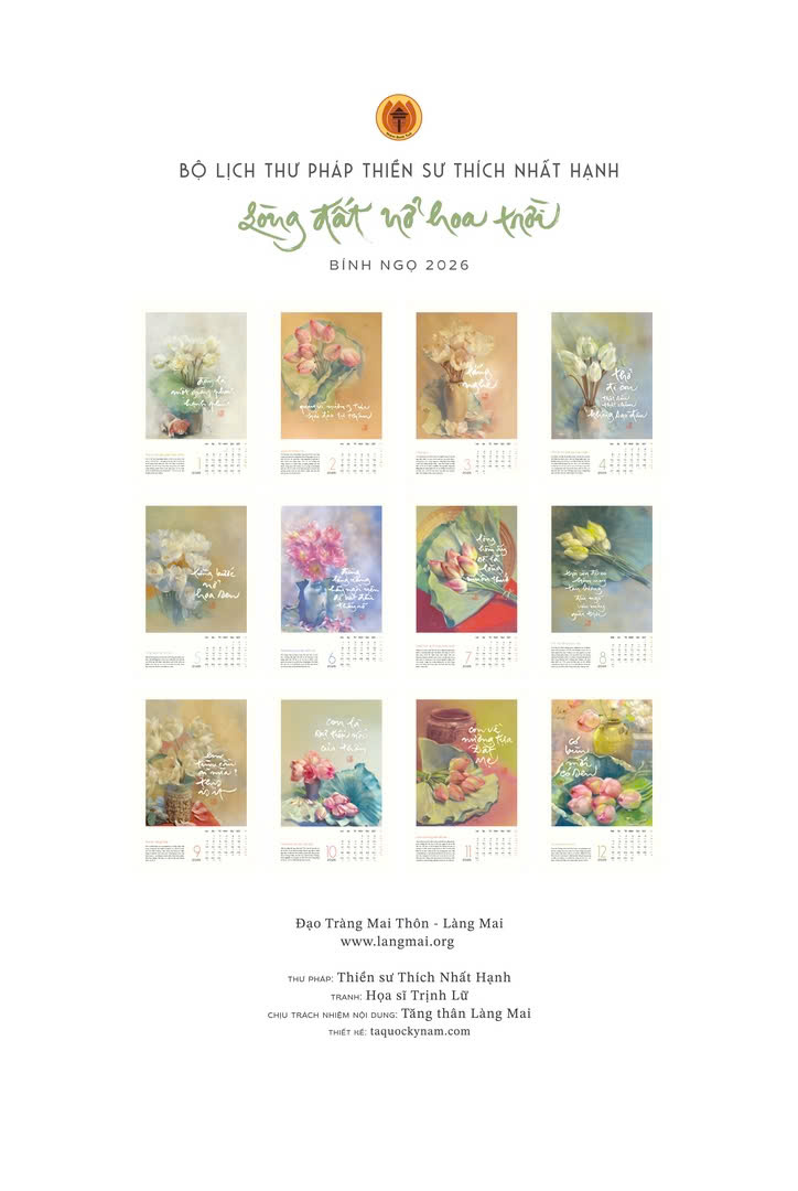 Năm nay, Tăng thân Làng Mai cùng Thái Hà Books trân trọng gửi đến bạn ấn phẩm lịch đặc biệt với chủ đề “Lòng đất nở hoa trời”. Mỗi tờ lịch không chỉ là một mốc thời gian, mà còn là một cánh cửa nhỏ dẫn về chánh niệm – nhắc ta dừng lại, thở sâu và sống thật.