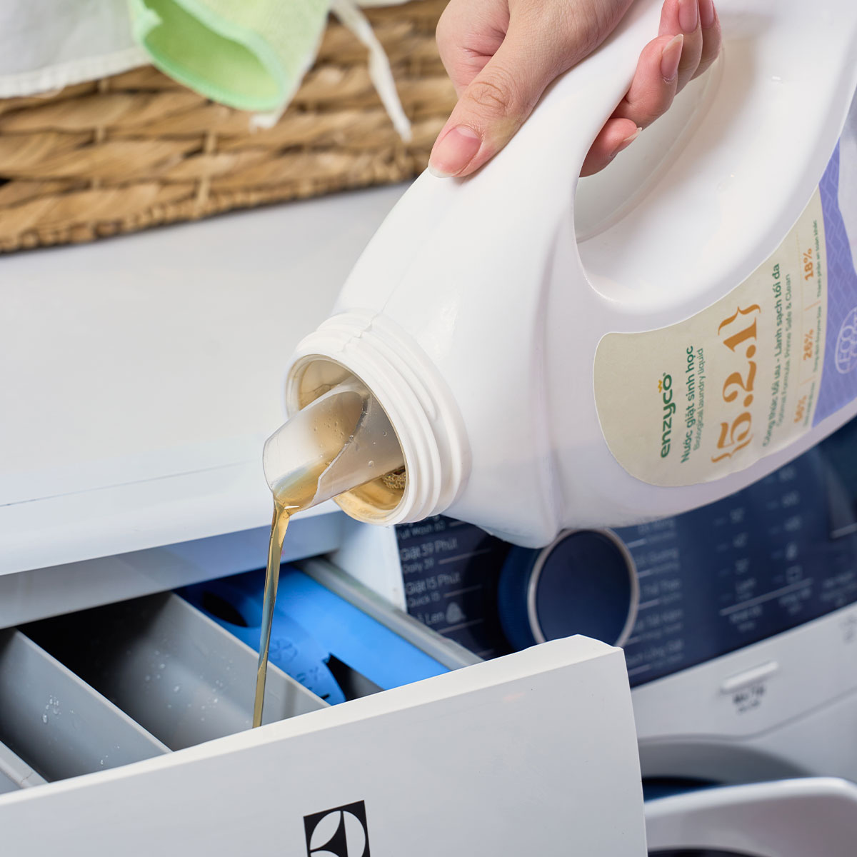 Giặt máy: Đổ nước giặt vào nắp, chấm một ít nước giặt lên vết bẩn và xoa nhẹ, sau đó đổ phần còn lại vào máy giặt.