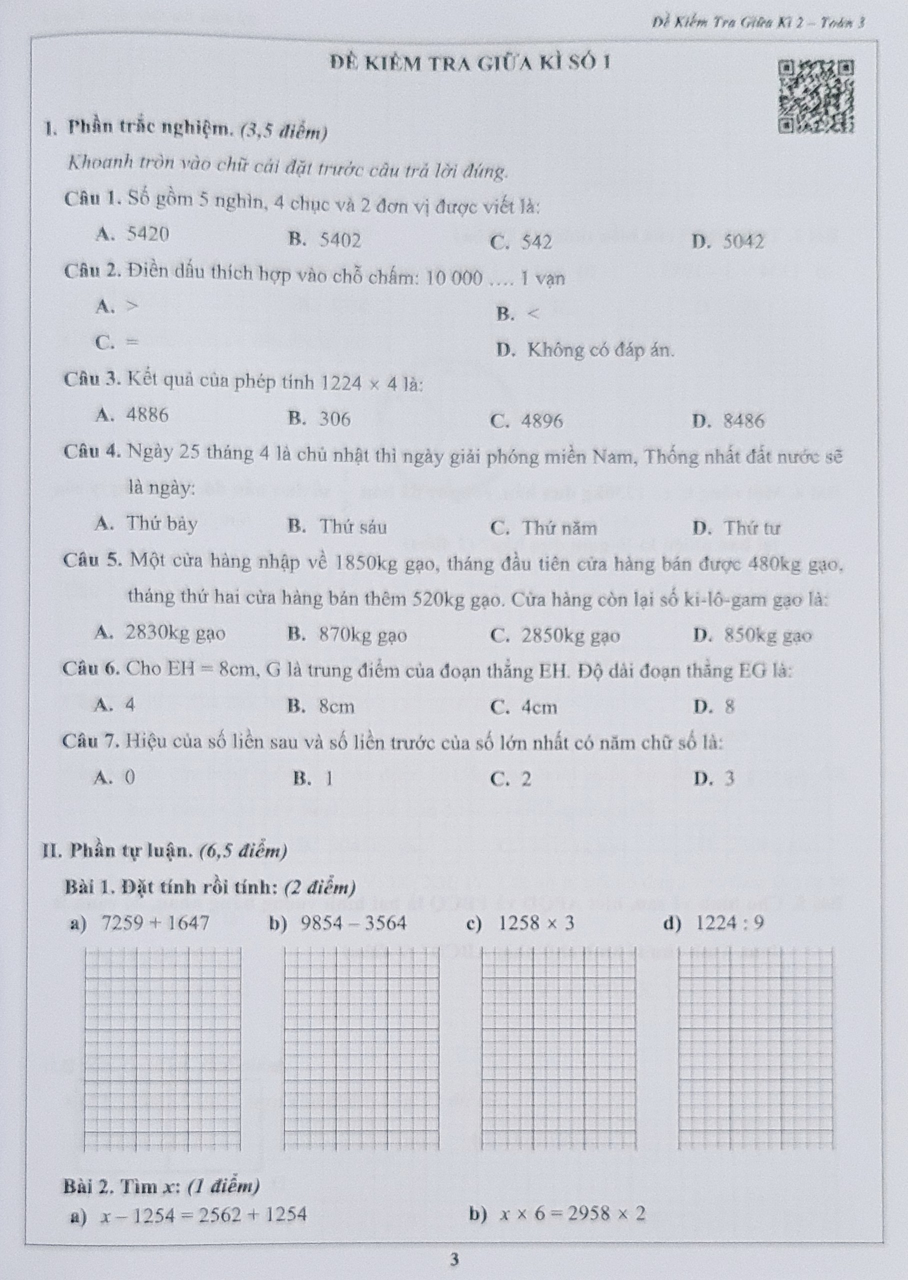 Đề số 1 | Đề kiểm tra giữa học kì 1 | Toán lớp 3 | Kết Nối | Thầy Nguyễn Văn Quyền