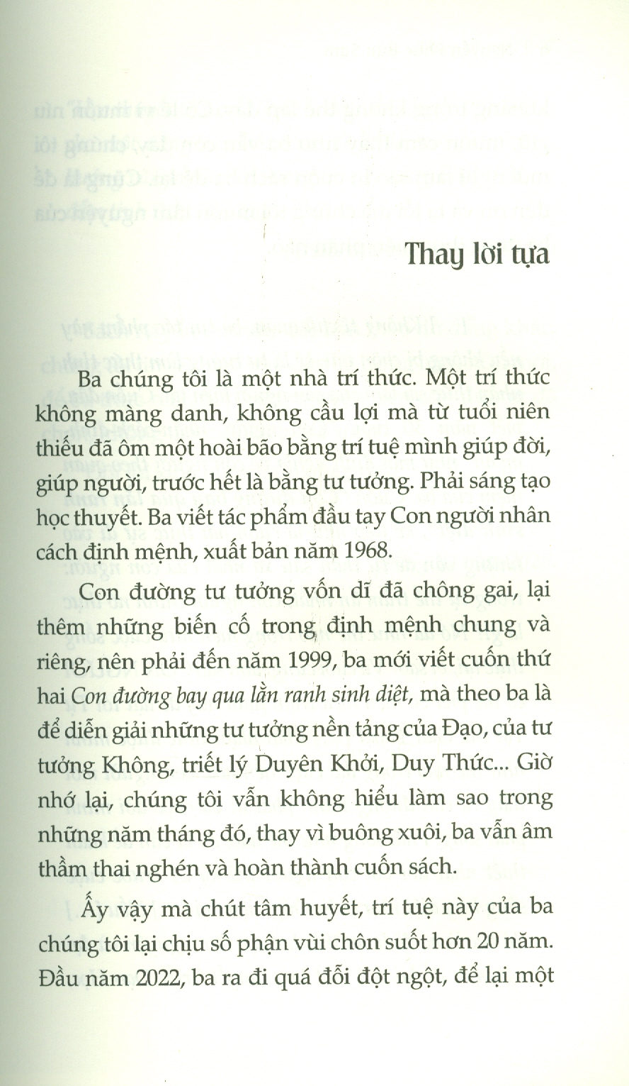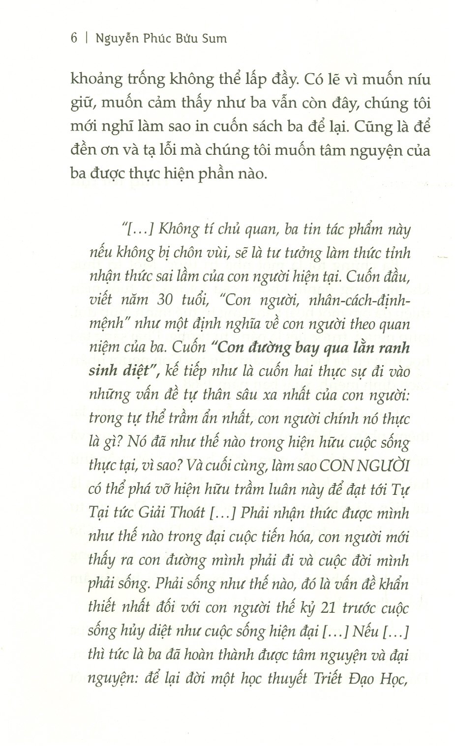 “[] Không tí chủ quan, ba tin tác phẩm này nếu không bị chôn vùi, sẽ là tư tưởng làm thức tỉnh nhận thức sai lầm của con người hiện tại. Cuốn đầu, viết năm 30 tuổi, “Con người, nhân-cách-định-mệnh” như một định nghĩa về con người theo quan niệm của ba. Cuốn “Con đường bay qua lằn ranh sinh diệt", kế tiếp như là cuốn hai thực sự đi vào những vấn đề tự thân sâu xa nhất của con người trong tự thể trầm ẩn nhất, con người chính nó thực là gì? Nó đã như thế nào trong hiện hữu cuộc sống thực tại, vì sao? Và cuối cùng, làm sao CON NGƯỜI có thể phá vỡ hiện hữu trầm luân này để đạt tới Tự Tại tức Giải Thoát [] Phải nhận thức được mình như thế nào trong đại cuộc tiến hóa, con người mới thấy ra con đường mình phải đi và cuộc đời mình phải sống. Phải sống như thế nào, đó là vấn đề khẩn thiết nhất đối với con người thế kỷ 21 trước cuộc sống hủy diệt như cuộc sống hiện đại [] Nếu [] thì tức là ba đã hoàn thành được tâm nguyện và đại nguyện: để lại đời một học thuyết Triết Đạo Học, “Học thuyết về Con Người”, làm nền tảng ý thức hệ cho một dòng văn hóa mới, từ đó là một phương hướng văn minh mới, mang cái nội dung Phật chất, đẫm tinh thần Đại Thừa Phật giáo.” – Trích thư của tác giả gửi những người con (1999)