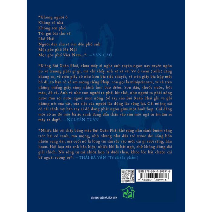 “Riêng Bùi Xuân Phái, chưa mấy ai nghe anh tuyên ngôn này tuyên ngôn nọ về trường phái gì gì, mà chỉ thấy anh vẽ và vẽ. Vẽ ở toan (toile) căng khung to, vẽ trên giấy cỡ nhỏ hơn bìa tiểu thuyết, vẽ trên giấy bìa hộp mứt bỏ đi, có bạn tỏ vẻ am tường tiếng Pháp, còn gọi là minipeinture, vẽ cả trên những miếng giấy cứng nhỉnh hơn bao diêm. Sơn dầu, thuốc nước, bột màu, đủ cả. Anh vẽ như con người ta phải hít thở, như người ta phải uống nước đun sôi nước nguội men nồng. Sổ tay của Bùi Xuân Phái ghi và ghi những nét của vật, của việc của người lúc động lúc sững lại. Cái miệng cái cổ cái cánh tay bàn tay ai đó đang phát ngôn giữa một buổi họp. Cái dáng một cô áo đỏ một bà áo xanh đang dấn thân vào tim một ngã tư ầm ầm xe máy xe đạp”.                                                                         Nguyễn Tuân “Nhiều khi tôi thấy bảng màu Bùi Xuân Phái khẽ rung như cánh bướm vàng trên bãi cỏ xanh, mơ mộng, nhớ nhung như đứa trẻ trước đời sống hồn nhiên vụng dại, mà cuối nó là lòng tin sâu sắc vào một cái gì tươi sáng, hân hoan. Hội họa của anh báo hiệu, nhiều khi là bất ngờ, chứ không dông dài giải thích. Nó sống tự tại nhiều hơn là đuổi theo, khéo léo bắt chước cái bề ngoài tương tự”.                                                                          Thái Bá Vân                                                                          (Trích tác phẩm)