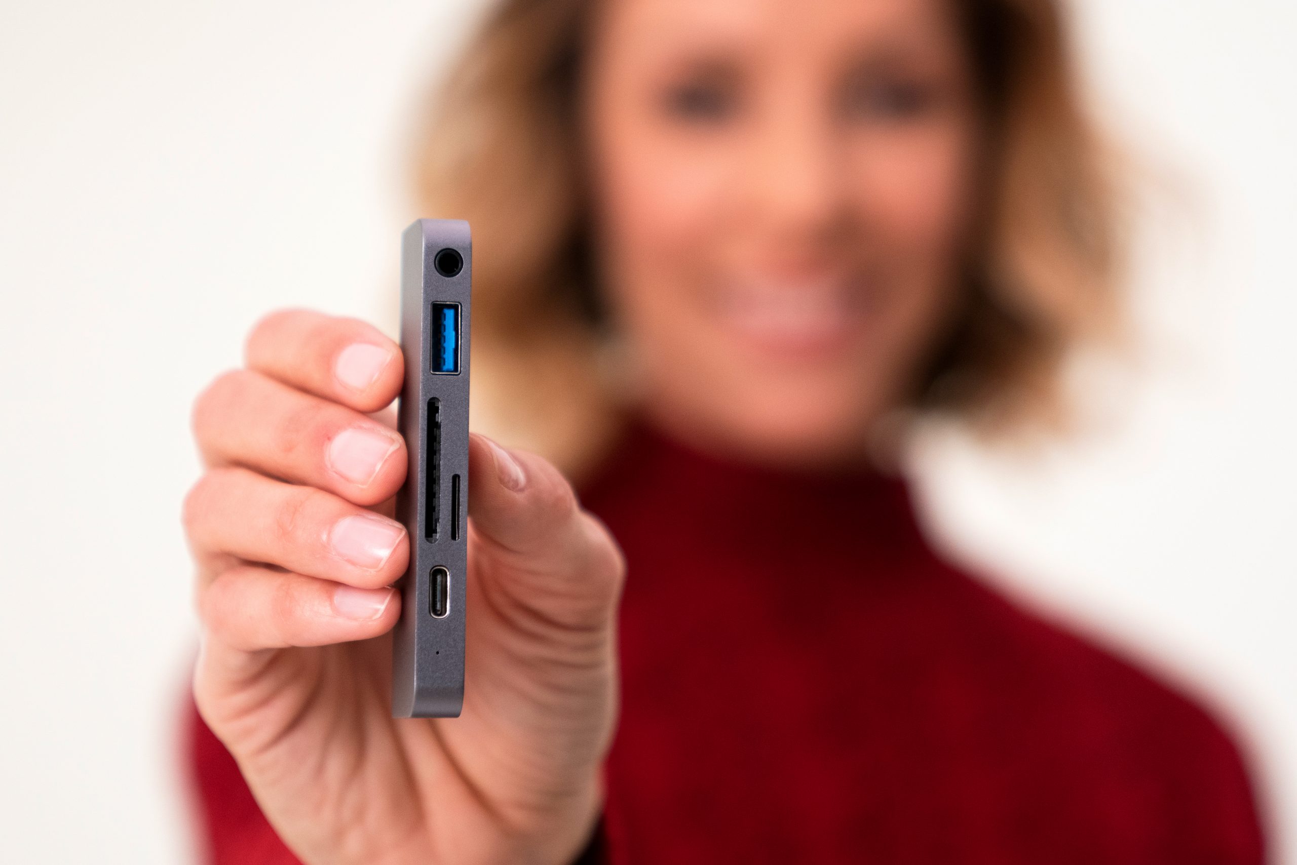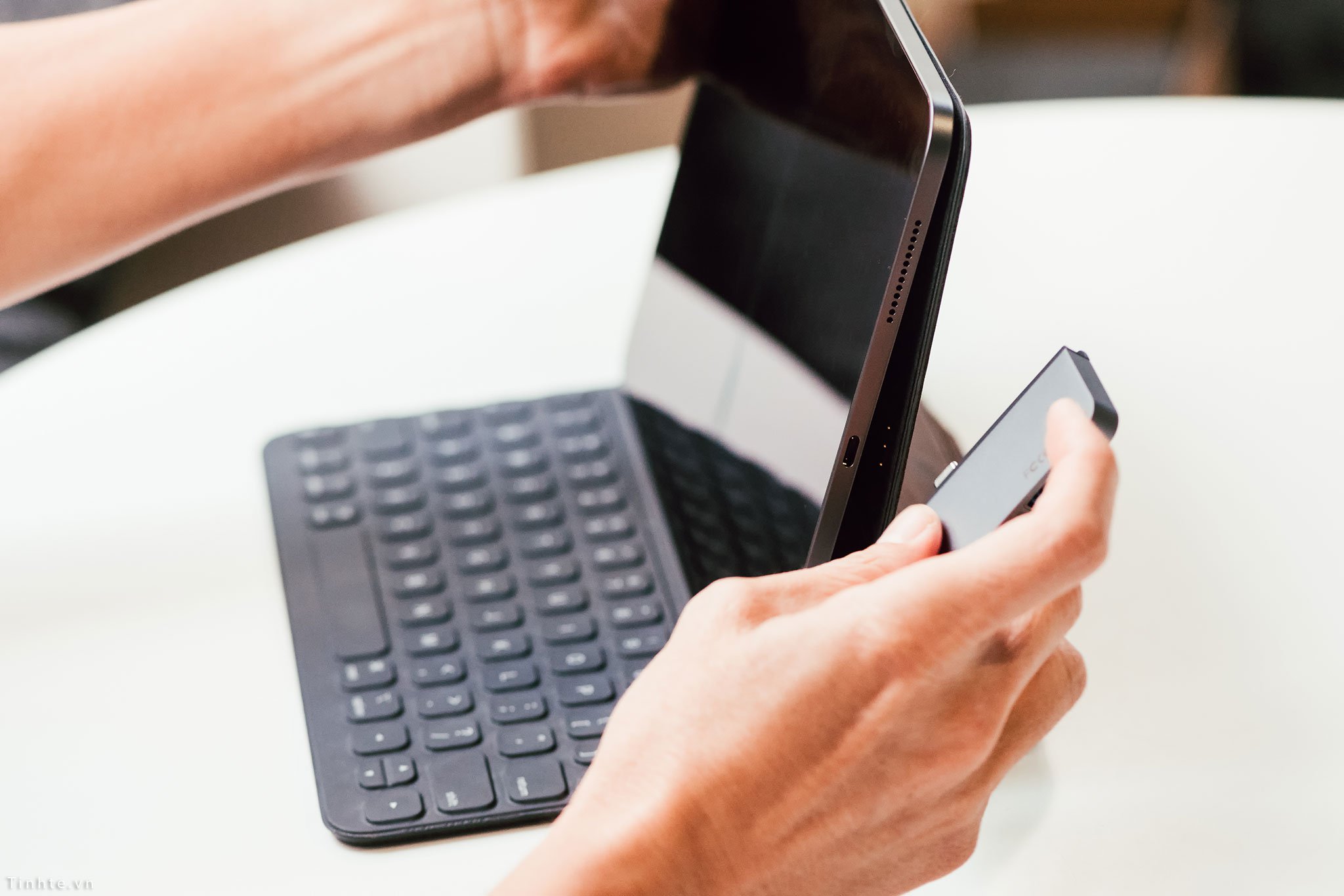 Tay cầm hình chữ C: Tay cầm này giúp giữ chặt chiếc hub với thiết bị, với chất liệu polycarbonate mềm và nhựa ABS để đảm bảo không gây trầy xước cho iPad Pro và cổng USB-C.
