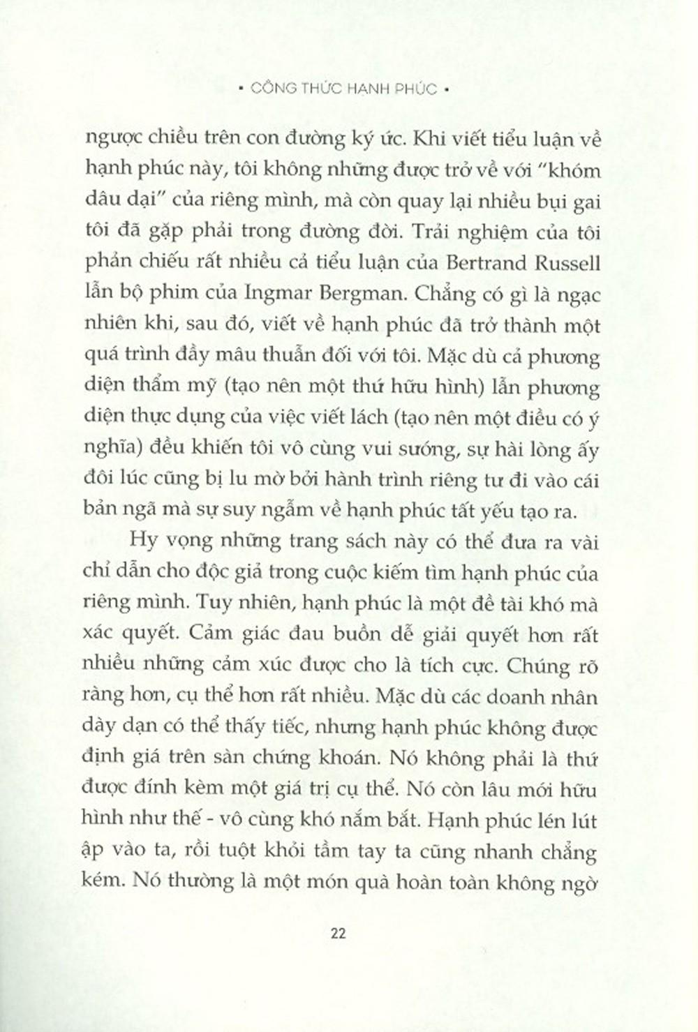 Trong cuốn sách này, Kets de Vries nỗ lực giải cấu trúc khái niệm trừu tượng ấy. Ông đi từ quan điểm sinh học, thống kê học, tâm lý học, triết học tự cổ chí kim đến cả các trích dẫn từ nhà văn, nhà thơ, nghệ sĩ, và trên hết, những trải nghiệm cá nhân, nhằm tìm ra một "đơn thuốc" giúp tăng cường khả năng đạt được hạnh phúc. Đơn thuốc ấy có hiệu quả hay không tùy thuộc ở mỗi người, nhưng có một điều chắc chắn: hạnh phúc luôn ở đâu đó, trong hiện tại và trong tương lai, và ta không bao giờ được mất hy vọng.