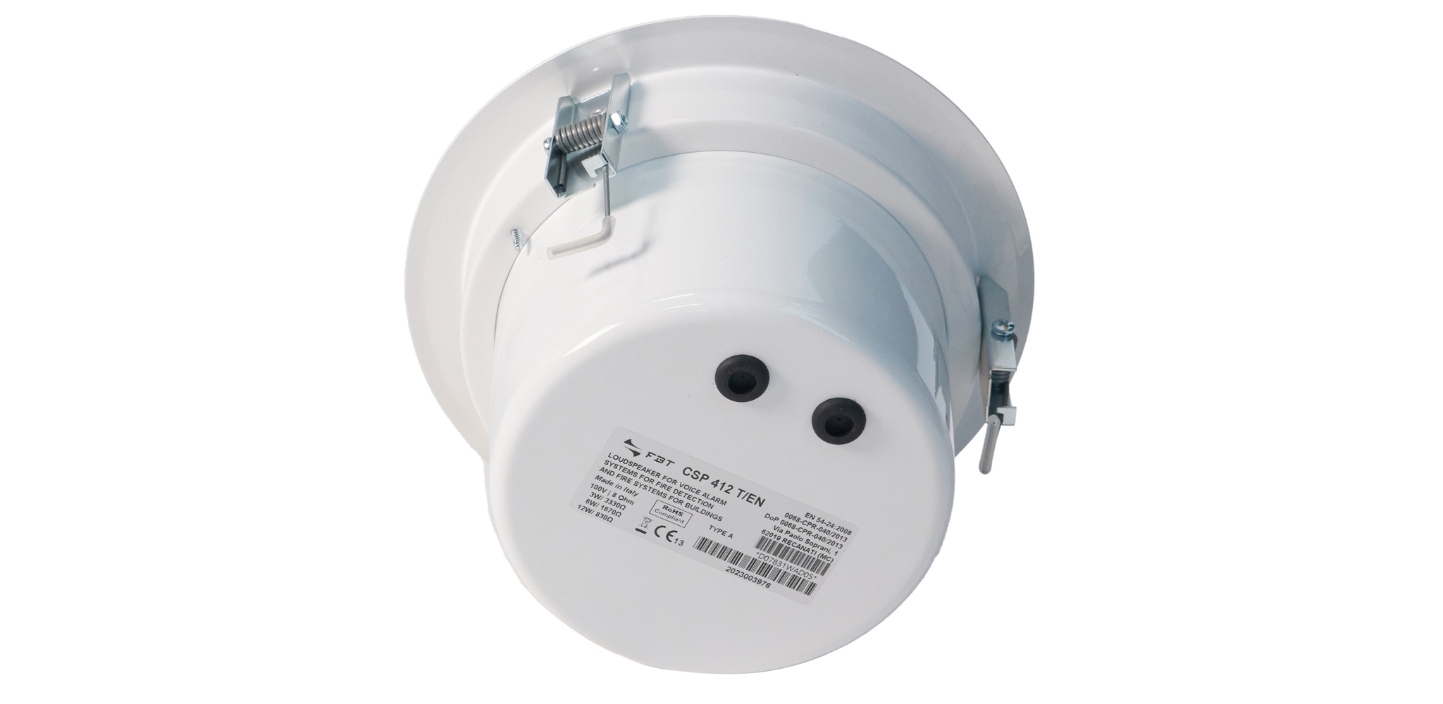 Bộ CSP 406 T/EN và CSP 412 T/EN, thích hợp để gắn trên trần giả, đảm bảo khả năng tái tạo xuất sắc cả giọng nói và âm nhạc. Được làm bằng tấm kim loại dập nổi được xử lý bằng sơn trắng chống xước và không phản chiếu, chúng sẽ phù hợp một cách trang nhã với mọi môi trường. Mỗi bộ phận bao gồm một vòng chịu lực với các móc lắp nhanh bằng lò xo để dễ dàng cố định vào trần nhà. Mặt nạ trung tâm với loa được nối với biến áp đường dây vừa với vòng bằng chuyển động xoay tiện dụng. Theo thông số kỹ thuật của hệ thống sơ tán bằng giọng nói EN 54-24, dòng loa này có nắp chống cháy bằng thép mạ kẽm kép, kết hợp với các dải đầu vào/đầu ra bằng gốm, cầu chì nhiệt và đầu tiếp đất. Máy biến áp tích hợp cho phép kết nối với các đường dây điện áp không đổi ở 100,