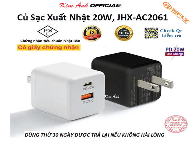 Củ sạc xuất Nhật 20W KFLY ( JHX-AC2061) chứng nhận PSE tiêu chuẩn Nhật Bản, dùng thử 30 ngày, bảo hành chính hãng 12 tháng,