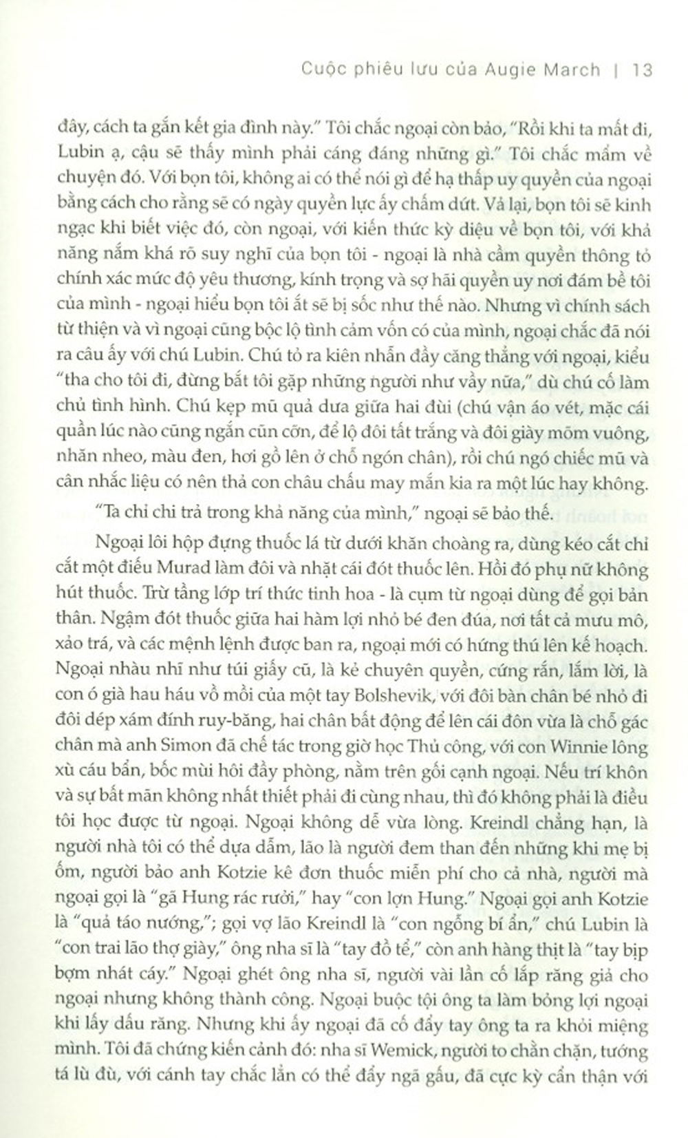 Với Cuộc phiêu lưu của Augie March, Saul Bellow đã kể lại hành trình độc nhất vô nhị của người hùng du đãng picaresque Augie March: một thanh niên thậm duyên dáng, một kẻ cơ hội chủ nghĩa xảo trá, một gã khờ trong lưới tì Rời bỏ xuất thân Do Thái di cư nghèo khổ, Augie March hăm hở bước vào công cuộc tìm kiếm lẽ sống của đời mình dưới các ống cống và nhà ga tại Chicago, quẩn quanh những trường đại học ở New York, hay ngoài rừng rậm Mexico giữa bầy thằn lằn hoang dã Hành trình phi thường của Augie March là biểu tượng cho sự tái sinh lý tưởng tự do của giấc mơ Mỹ, và đặc biệt hơn, đã “viết lại” ngôn ngữ của cả một thế hệ.