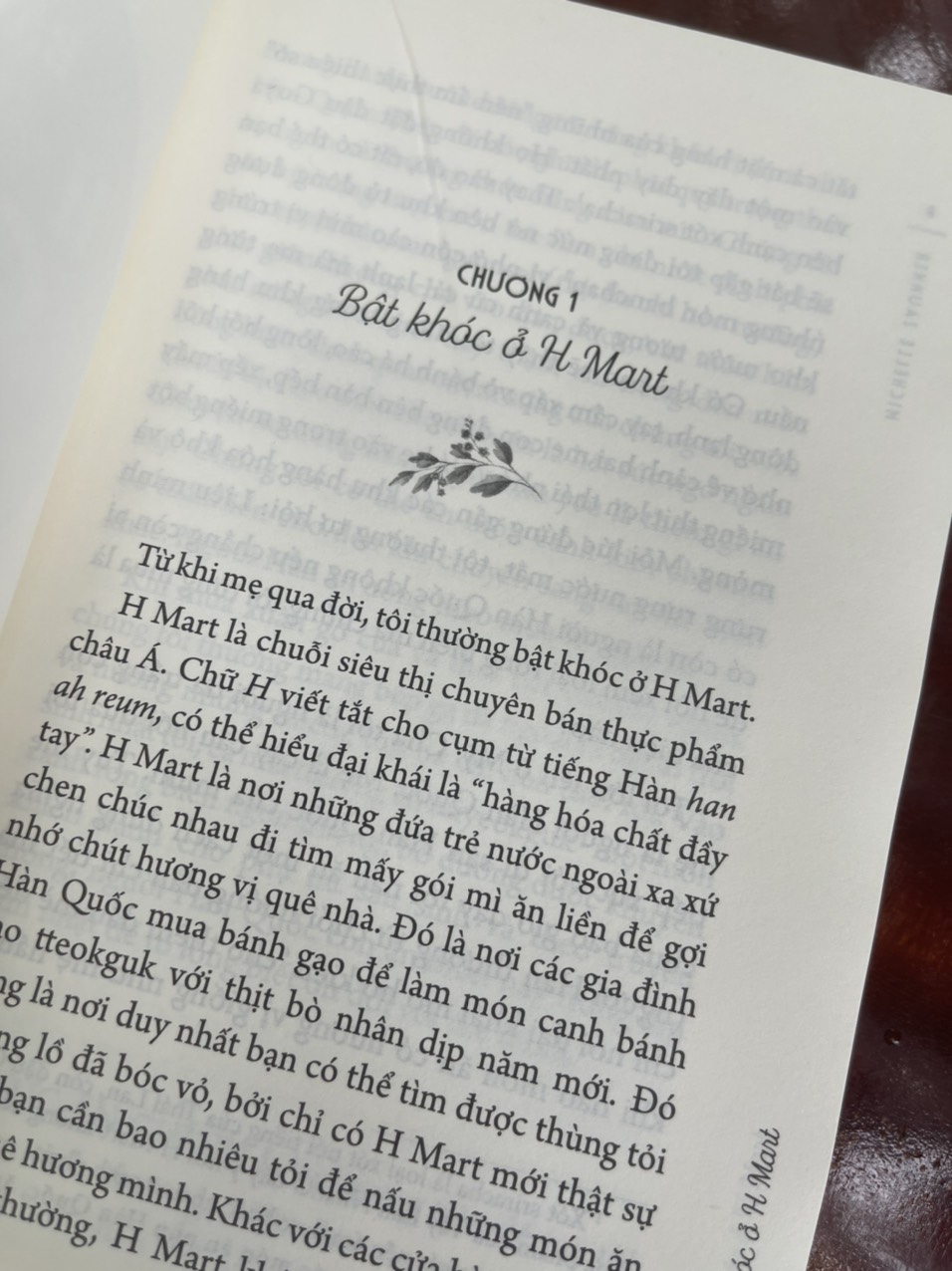 “Từ khi mẹ qua đời, tôi thường bật khóc ở H Mart.” Michelle Zauner mở đầu cuốn hồi ký đầu tay của cô, cũng là bài viết nổi tiếng trên tờ The New Yorker, “Bật khóc ở H Mart”, bằng một lời tự sự chân thành buồn bã. Sau sự ra đi đầy đau đớn của người mẹ, Michelle thường đến H Mart – chuỗi siêu thị Hàn Quốc (và châu Á) lớn ở Mỹ – để giải tỏa và tìm lại bản thân, tìm lại bằng chứng về một nửa dòng máu Hàn Quốc trong mình. Cô giận dữ khi nhìn thấy một người phụ nữ Hàn có thể sống lâu hơn mẹ, chạnh lòng khi nhìn thấy hình ảnh những người thân trong cùng một gia đình chia sẻ những món ăn… Michelle cảm thấy hoảng sợ khi nhìn sự ra đi của mẹ đồng nghĩa với sự mất mát vĩnh viễn một nửa gốc gác Hàn của cô, nên xuyên suốt cuốn truyện là hành trình cô cố gắng từng chút, từng chút một đi tìm lại nguồn cội của bản thân.
