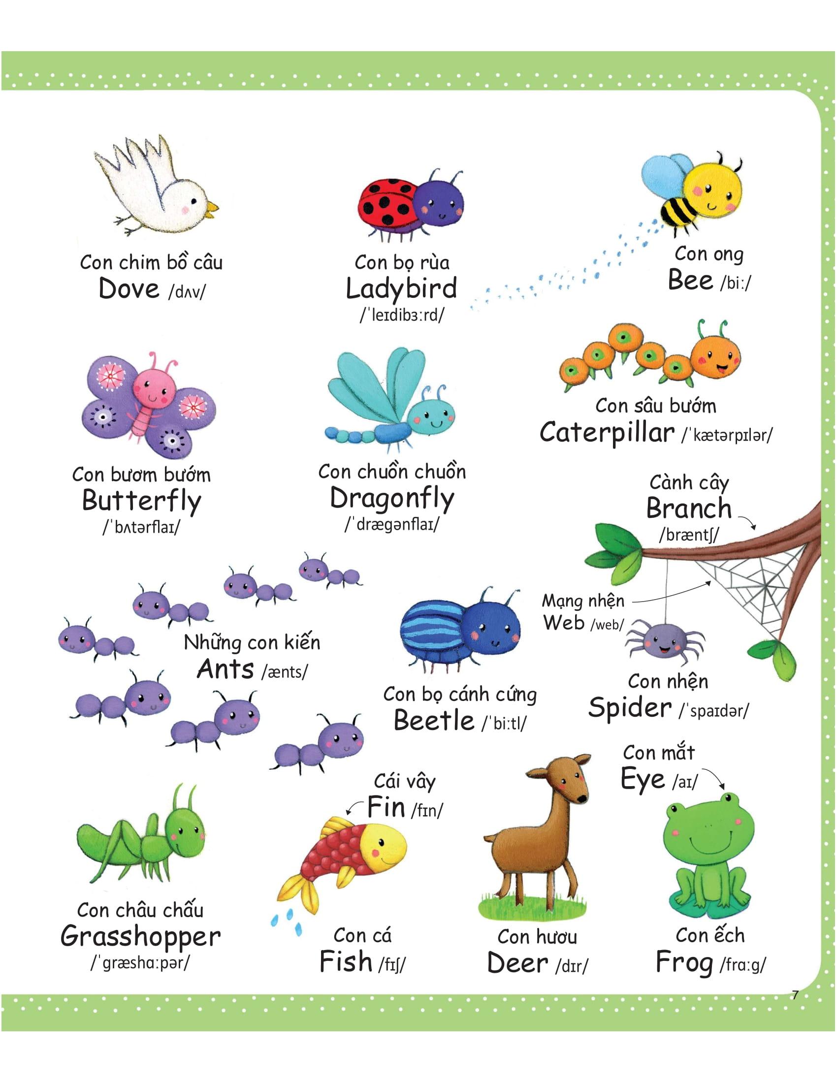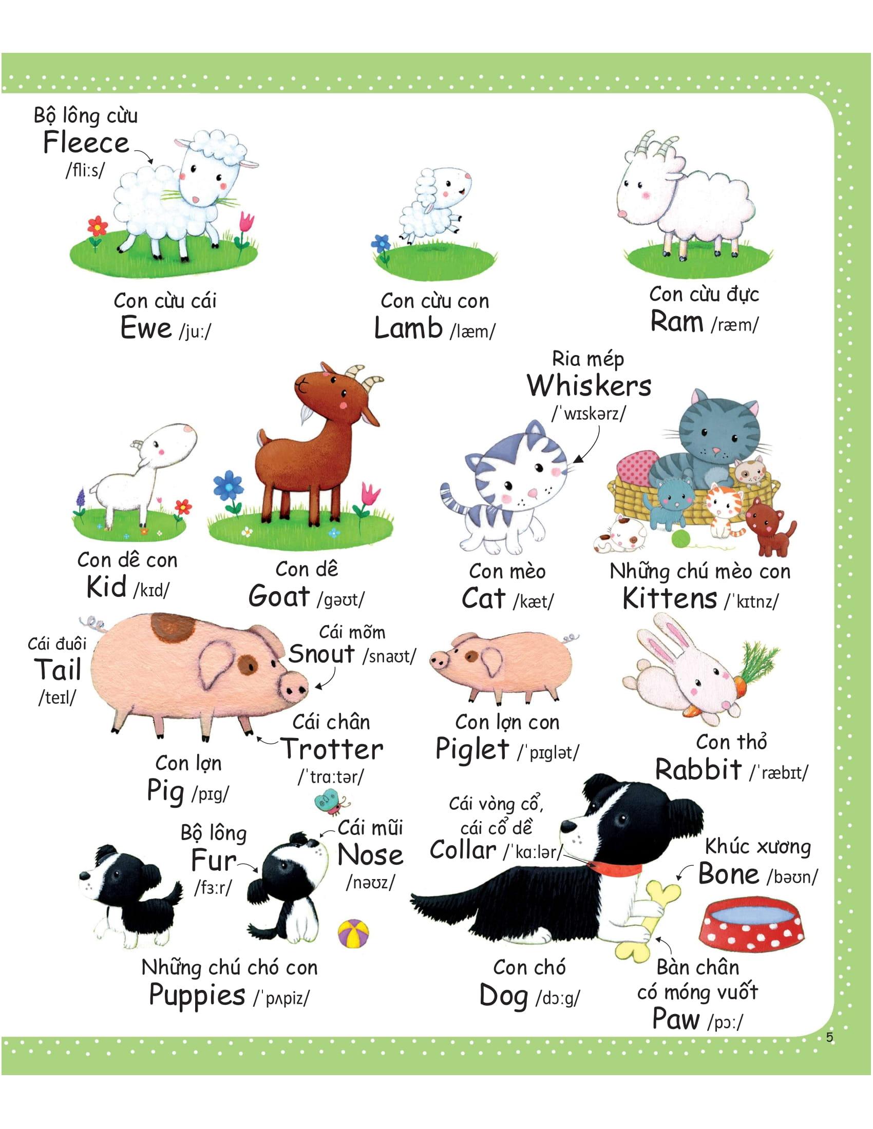 Với bộ sách này, bé sẽ được học hơn 270 từ vựng tiếng Việt và tiếng Anh, với những hình minh họa sống động tuyệt vời. Các chủ đề bao gồm số đếm, động vật, cơ thể người, phương tiện giao thông và giờ đi ngủ…