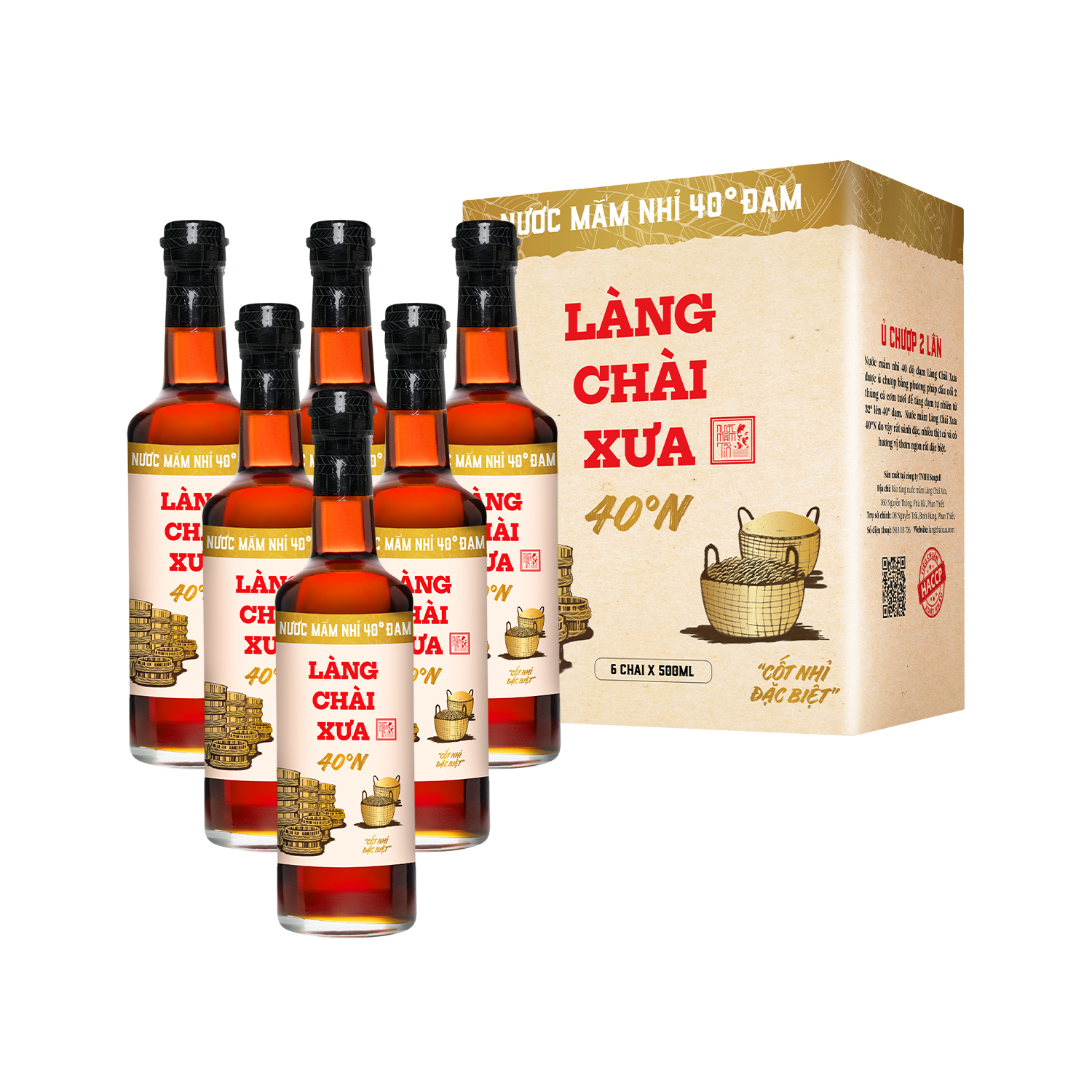 Thùng 6 chai nước mắm nhỉ 40 độ đạm Làng Chài Xưa nhãn vàng chai thủy tinh 500ml ủ chượp 2 lần