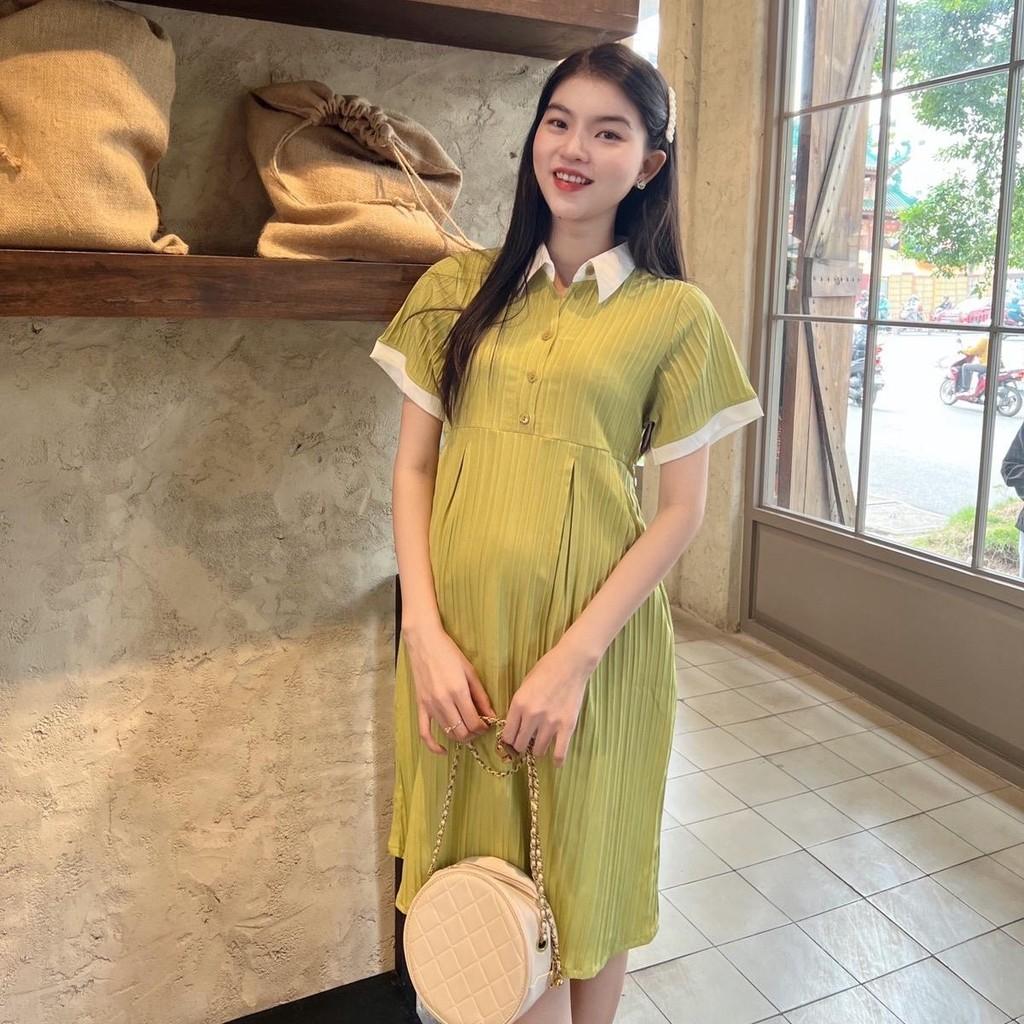 Đầm bầu babydoll đũi gân cổ sơ mi thanh lịch, phối màu bầu diện dễ thương, trẻ trung, năng động.